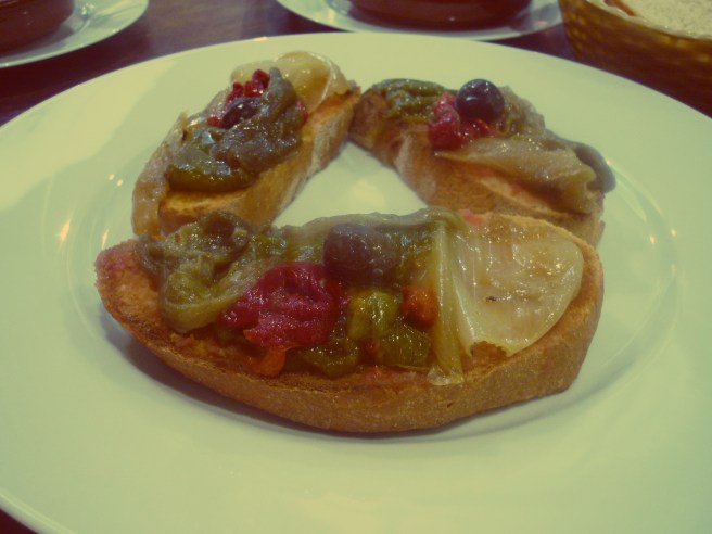 We were advised by the lovely front of house lady that we should go for four tapas dishes for the two of us and then a torradas (toasted bread) with roasted peppers and aubergines to share. We chose chorizo cooked in wine, garlic prawns, patatas bravas, garlic chicken. Although we were slightly worried we over ordered, we managed to devour it all. Special mention must go to the patatas bravas which makes me want to return as soon as possible as well as the garlic prawns whose sauce is perfect mopped up with the complimentary bread. Currently there is a great deal going on in which if you get two tapas you get a glass of sangria all for £12. The Sangria is lovely, although perhaps the portions could be bigger as it is extremely easy to drink!