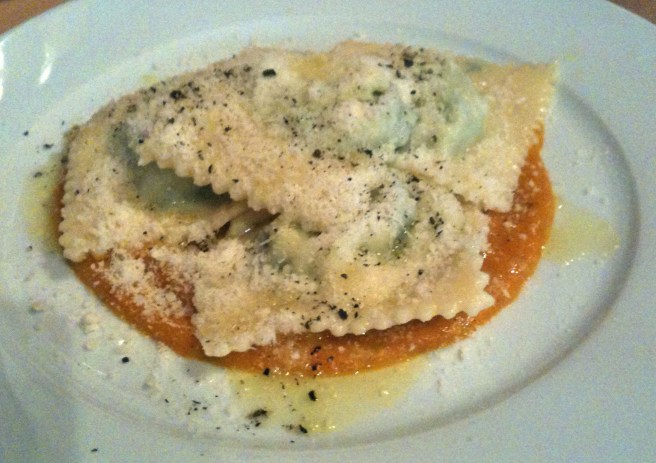 Ravioli di scamorza, spinaci e mascarpone con salsa alla zucca (Ravioli stuffed with scamoza cheese, mascarpone and spinach with pumpkin sauce)