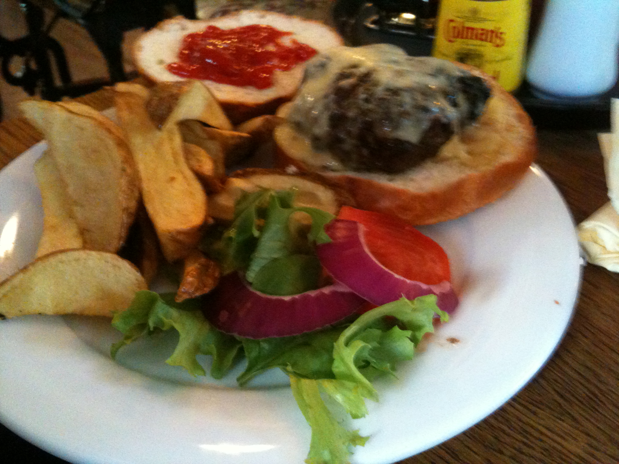 The food again is traditional pub grub such as burgers, scampi and pies, but their specials board appears to change each week. The week that we visited had Thai curry and chilli con carne on offer. You order at the bar and the food arrives in about 30 minutes, although I guess it depends on how busy the pub is (warning: nights when there are gigs on at Brixton Academy and the Thursday pub quiz night are particularly busy). We went for a burger with Montery Jack cheese, scampi and wedges, chilli con carne and the selection of pies.