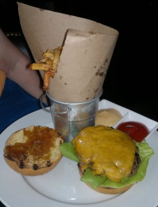 “Riot Sling” – made up of Gordon’s London Dry Gin, Lemon, Honey, Harney & Sons Earl Grey and Ginger Beer was served with a hefty portion of ice and made me want to sleep very early on top of jet lag. My partner had the “Mind the Gap” which was described as Cardhu Scotch Whisky, Drambuie, Dry Vermouth, Aromatic Bitters and Lemon. The last ingredient was a piece of peel wiped around the rim and then dropped into the glass. All this too with a lot of ice. We had these first before we ate so we decided food was a must despite our lassitude. We had red wine with our meal – a glass each of Cabernet Sauvignon (the “cab” to our waitress) and a Pinot Noir. They were both really smooth and not at all different from each other but very palatable. There are beers to alleviate the homesickness with Boddington’s, Newcastle Brown, Bass Pale Ale, Black Sheep and even a Youngs double chocolate stout.