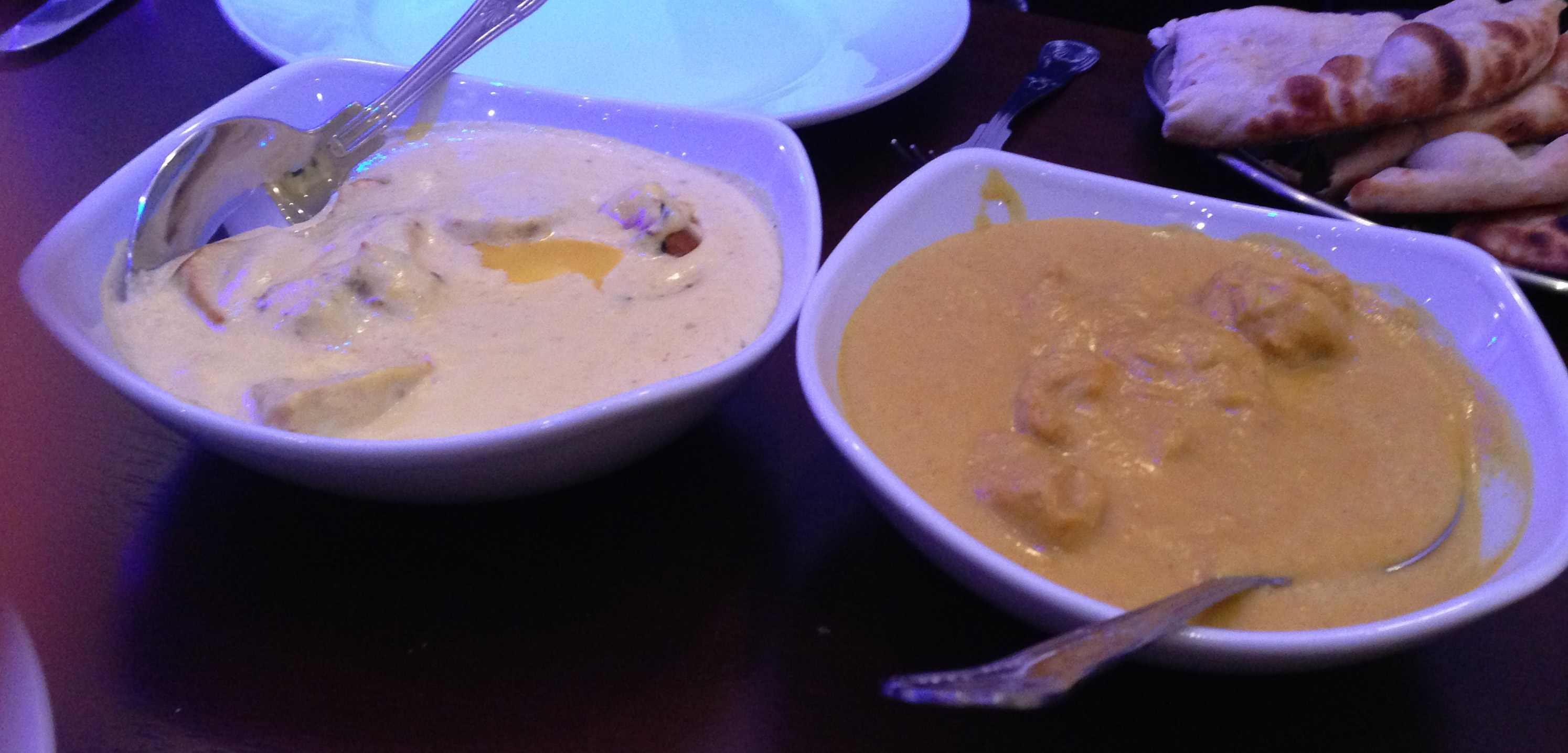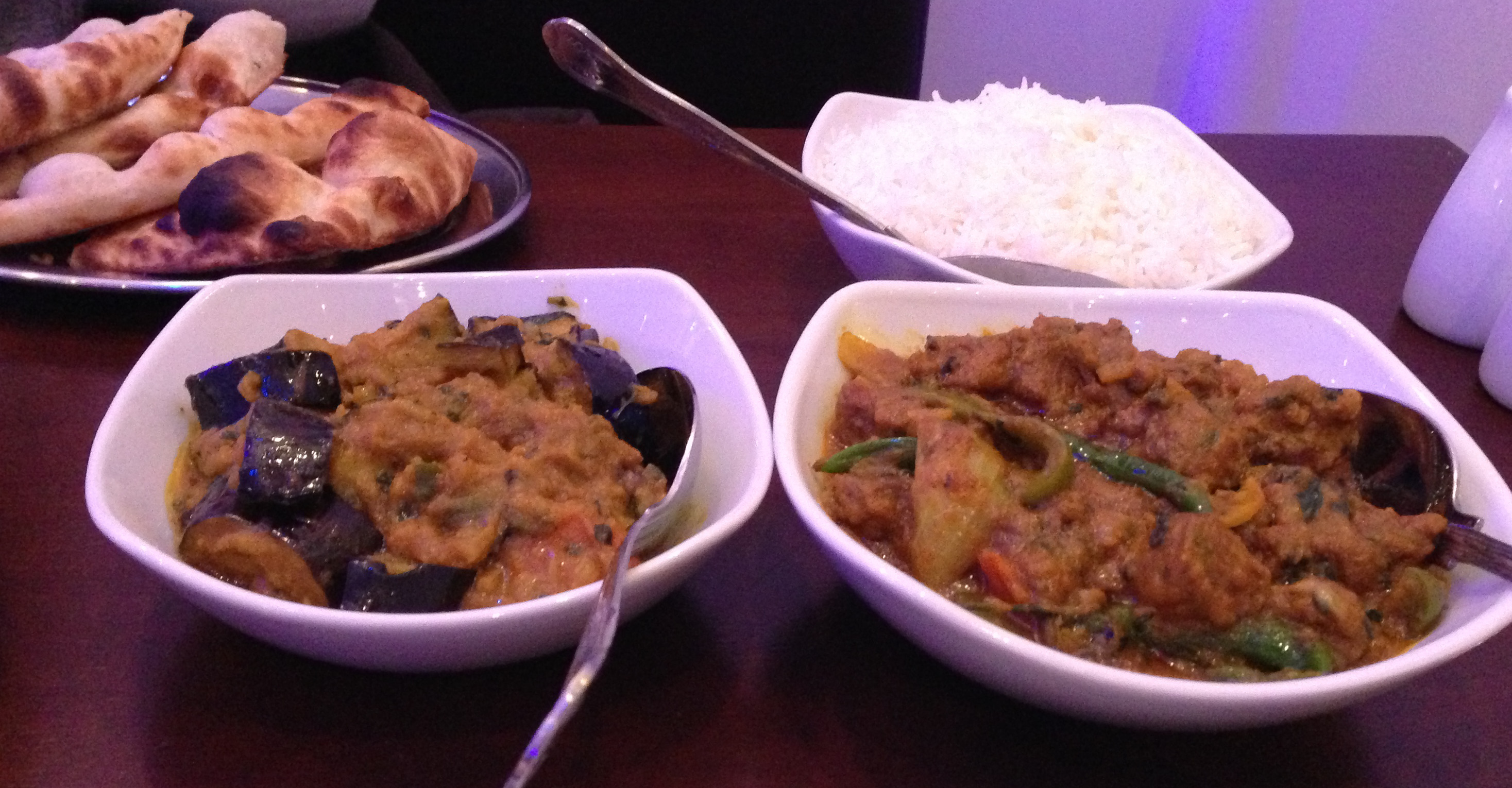 For our main courses we chose chicken korma, butter chicken, lamb jalfrezi and brinjai baji. For carbohydrate we had some plain rice and two naans – one plain and one peshwari.  Two of the dishes were lovely but we were a bit disappointed with the butter chicken as the sauce was cloying with little flavour (where was the exotic seasoning they offered us from the menu?). It was chosen as a reminder of a restaurant where it was first eaten in Delhi and I suppose we would bound to be disappointed. The chicken was delicious though – with good seasoning. But we want to leave a mention for the best part of the meal – the bread. Although naans cool pretty quickly these were hot and crispy round the edges and the three of us loved them – well done with the tandoor oven.