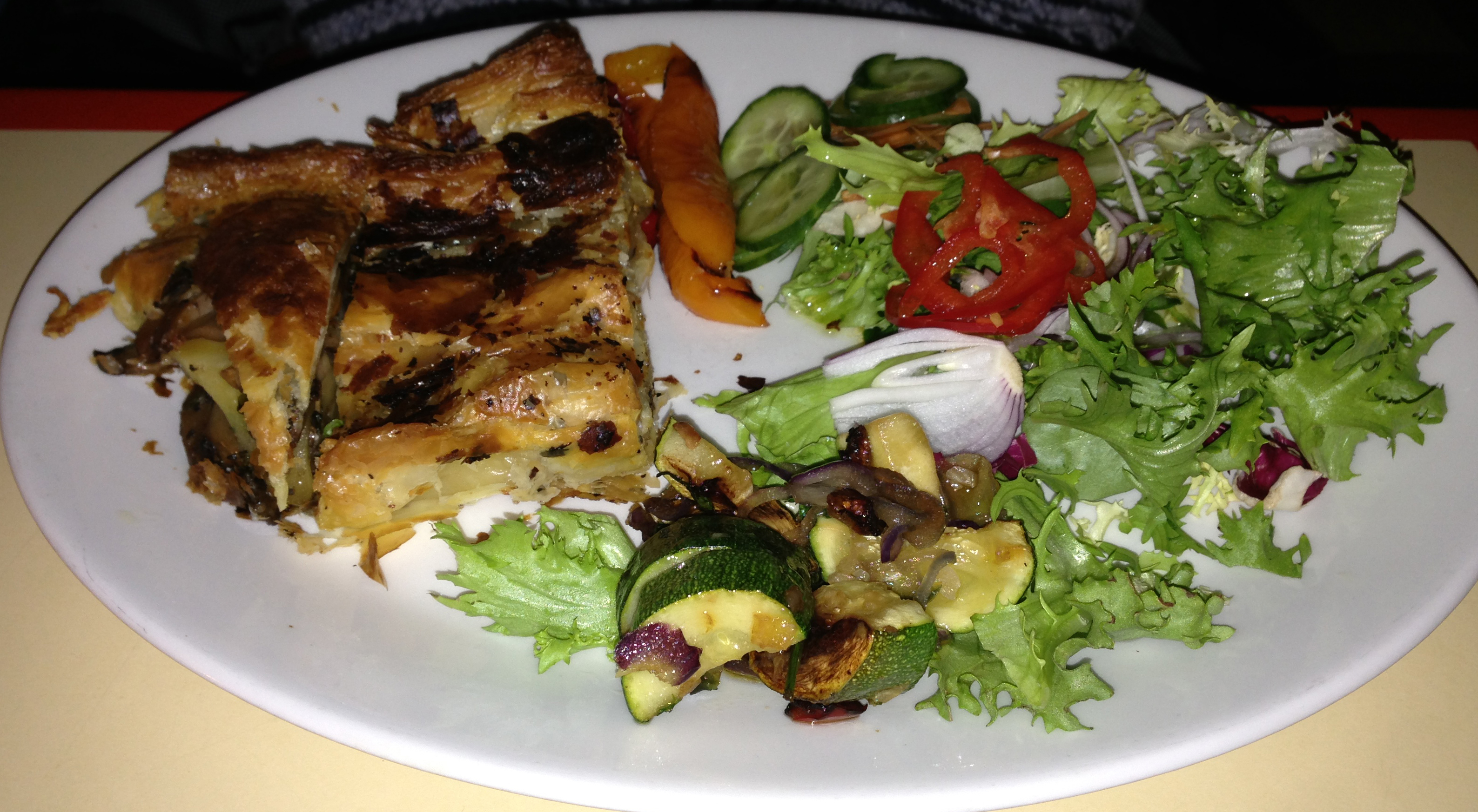 You have passed by the Express Cafe in Market Row during the day and you may even have popped in for a bacon sandwich, a mug of Nescafe or one of the cheapest espressos in Brixton. But each evening from Thursday to  Saturday and Sunday (9.00 – 4.00pm) this basic cafe metamorphoses into a French Vegetarian restaurant “L’Express”. The interior is from another era with 1950s cream decor and a bit of half timbering. The tables and chairs from the formica 1960s and, rather startlingly, there is a ceiling fan reminiscent of a Magritte painting as it is stuck up against a wall so cannot turn – presumably a leftover from an early renovation. Lighting is muted with table and standard lamps, flowers adorn each formica top and the pictures are eclectic. An old gramophone and a fruit machine provide further colour although we were not sure either worked. The music when we visited was rock and roll but it depends, we thought, on who brought the CDs or whether their live musician turns up.