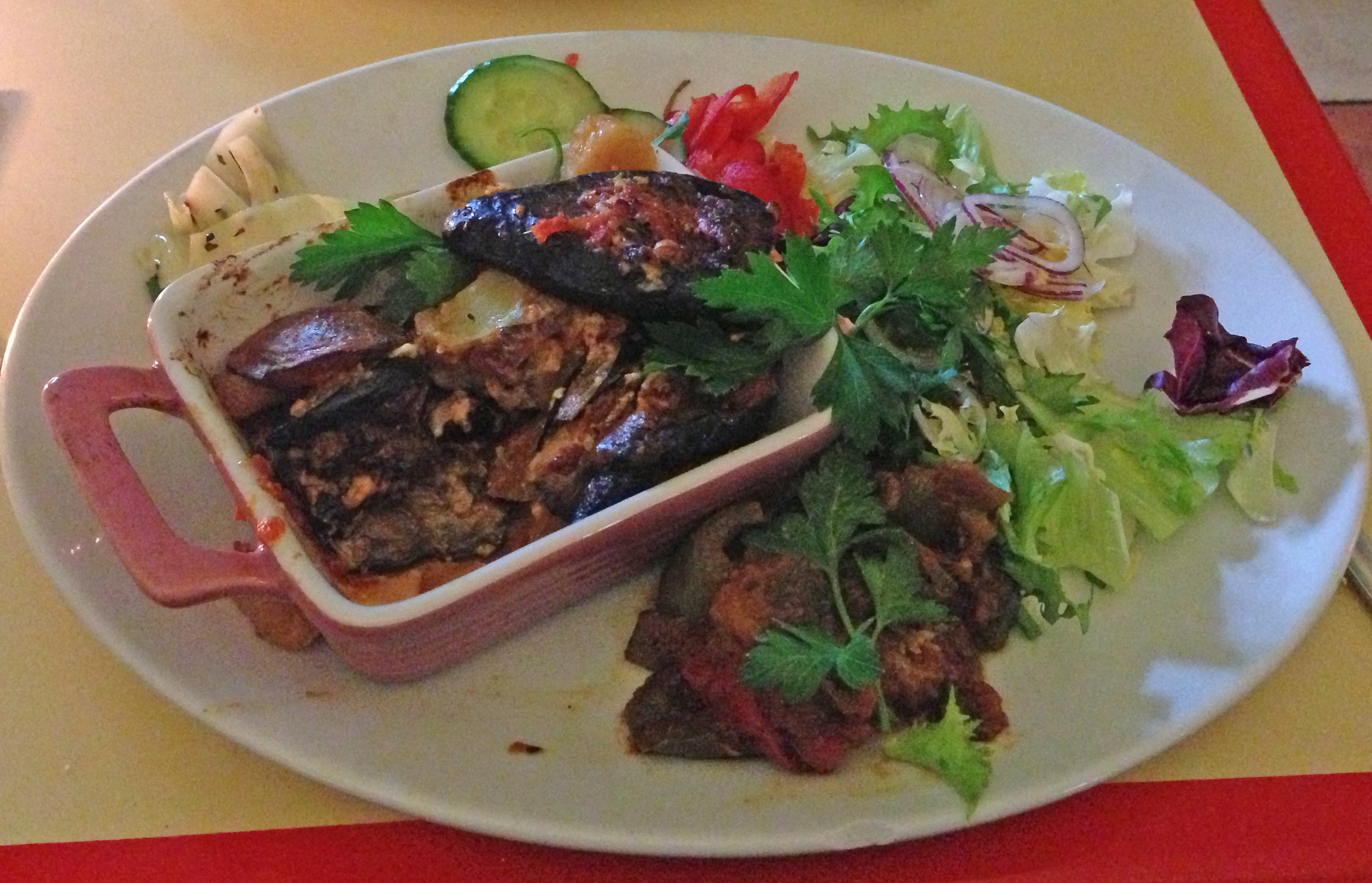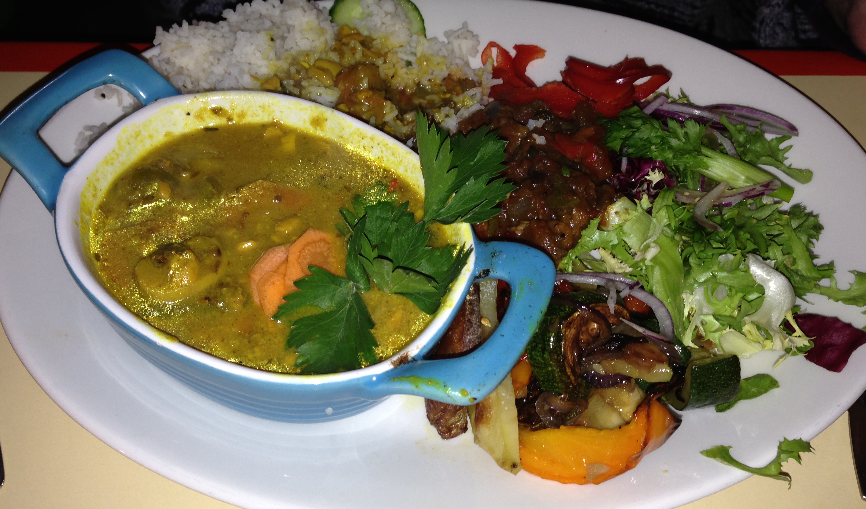 For main courses we chose the spicy yellow masala and the traditional french aubergine gratin (so this is definitely not all vegan). The gratin came with crunchy potatoes, ratatouille and salad and the plate was emptied. Roast vegetables were supposed to come too but didn’t and that was somewhat of a relief. The spicy yellow masala curry was just that. It came in a separate pot to pour over the rice, roasted vegetables and salad. It was also advertised with “surprises” which was a hearty spicy aubergine. We were surprised by another aspect of the meal as the yellow peas were still quite crunchy and may (for our taste) have been better cooked for a little longer – like an hour longer.  We didn’t have the Black Bean Caribbean cassoulet with rice, plantain, fruits, roasted vegetables and salad but we fear that if we had we would never have left the restaurant. We also declined the chocolate cake and the apple crumble. We were full to breaking point – but in a good way.
