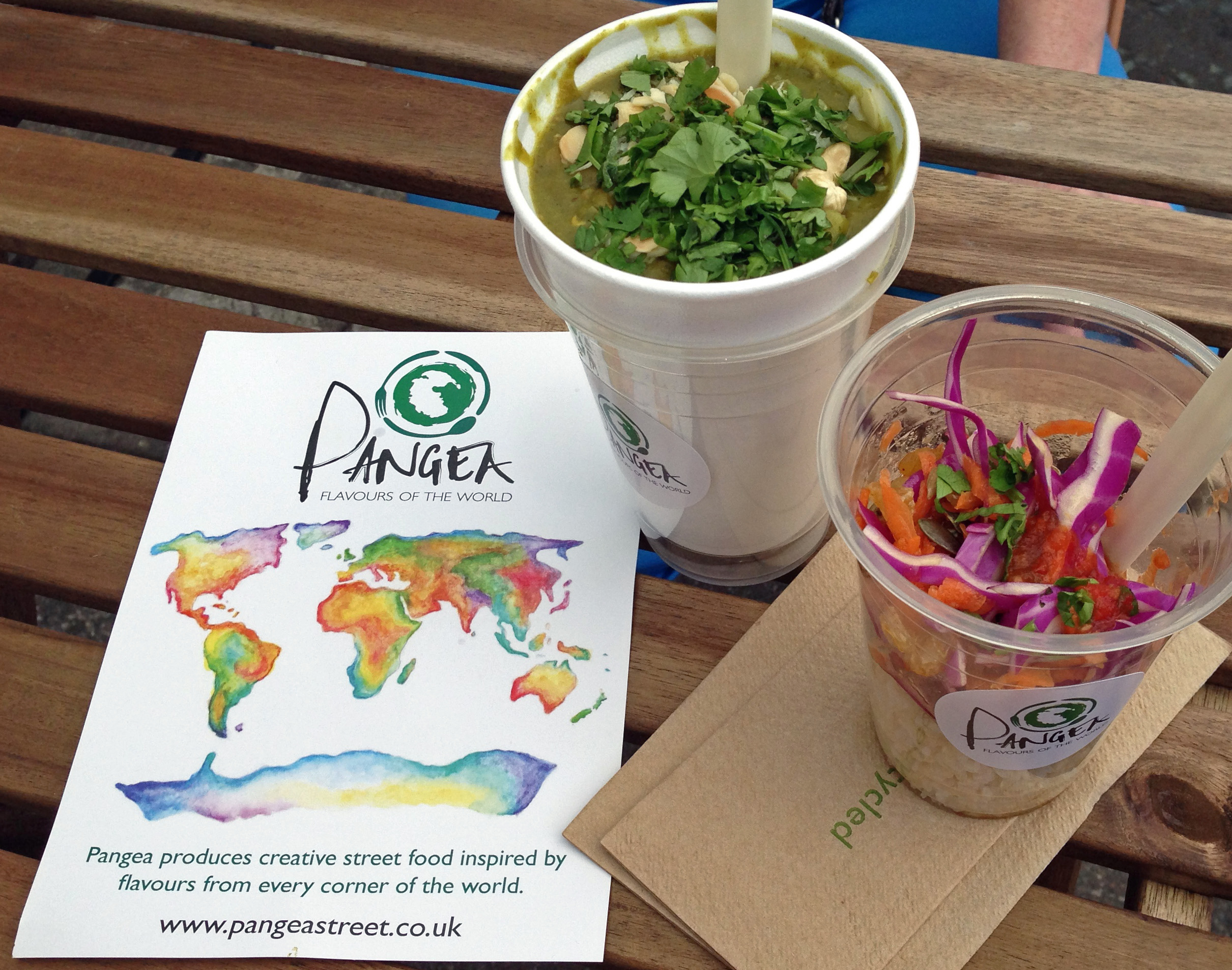 On this visit Pangea was selling vegetarian food but their leaflet describes fish dishes (BBQ Harissa Mackerel, Almonds, Pomegranate) and meat (English Pork Belly and Lobster, Cider reduction, pea puree) all descriptions more complex than we could imagine from the offering on our Friday visit. Available on this visit was lentil and potato curry topped with some nuts and (if you want it) tomato chili jam. There were three salad choices – all with brown rice and one of two dressings. We had the curry without the prawns and a cabbage and carrot salad with a soy and honey dressing. Although our day was vegetarian day they offer to grill a few prawns to add to the curry.