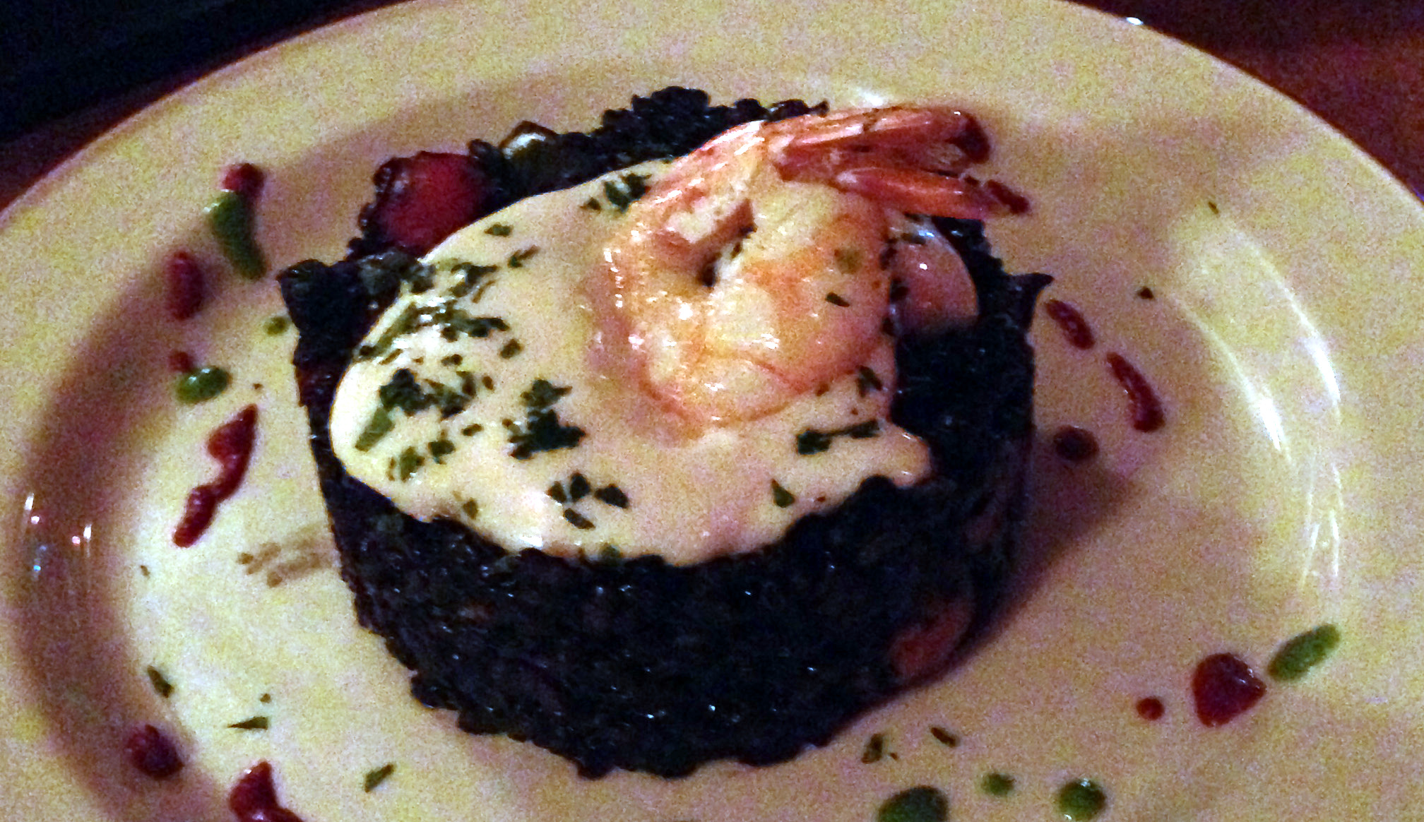 This is a tapas bar and more. The menu – not extensive (a relief) – is cut into several sections. There were starters (para empezar), meat and cheese, salads (ensaladas), paellas (you need to wait 25 minutes for these which is just about right) and then there are the tapas divided into traditional and Gremio. But what I really liked was that you didn’t need to ask what anything was — not a lot of Spanish except on the main headings and all the food was straightforward. So it was black rice with seafood and alioli — not a mention of “fragranced with saffron”, “steeped in …. or comes from the west bank of the high Mountains. We started with roasted broad beans – very salty and enough to eat with the first glass of wine as we waited for the food which arrived pretty swiftly. We then chose the black rice which was fantastic and I am not usually one to really go overboard on the compliments. Each grain of rice was lushly black with squid ink and soft but not so that it all stuck together. There were mysterious bits of seafood, prawns, squid and muscles) buried inside and creamy alioli on top and finished with a prawn. This was not just good to eat but a pretty picture too.