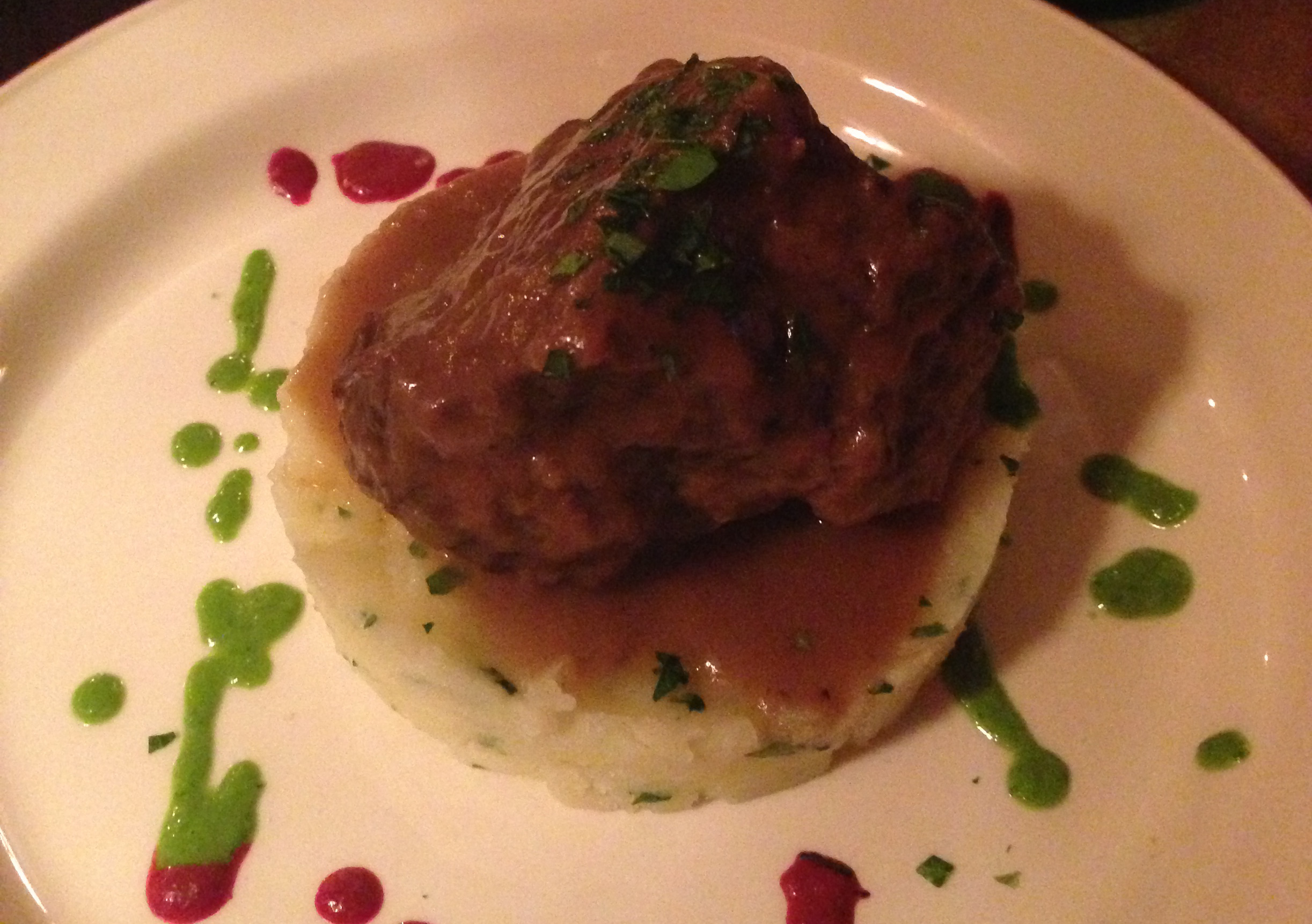 Then there was the Ox Cheek with smashed potatoes – again soft and easy to eat. Finally we had the prettiest dish – suckling pig with sweet potato crisps. This had dots of green (garlic) and red (I have no idea) around the sides and the square of meat was on top of a sweet apple sauce.