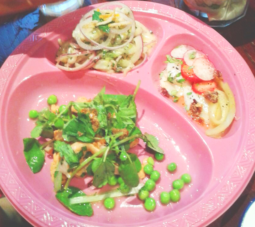 With a set menu we were first presented with a side order of Quinoa and boiled Sweet Potato which was filling certainly but the Quinoa could have done with a little more boiling and a bit more salt. But the centre of the menu was the ceviches. Ceviche (pronounced cebichay) is an uncooked (i.e. no heat involved) raw fish medley mixed with onion and “cooked” (i.e. marinated) in lime juice. It is served all over South America but Peru has the largest number of recipes. There were three delicious ones on our plate – a bright orange plastic picnic plate divided into three sections. The naked fish were different in each of the three sections – sea bass, scallop and trout – so different colours as well as different textures.