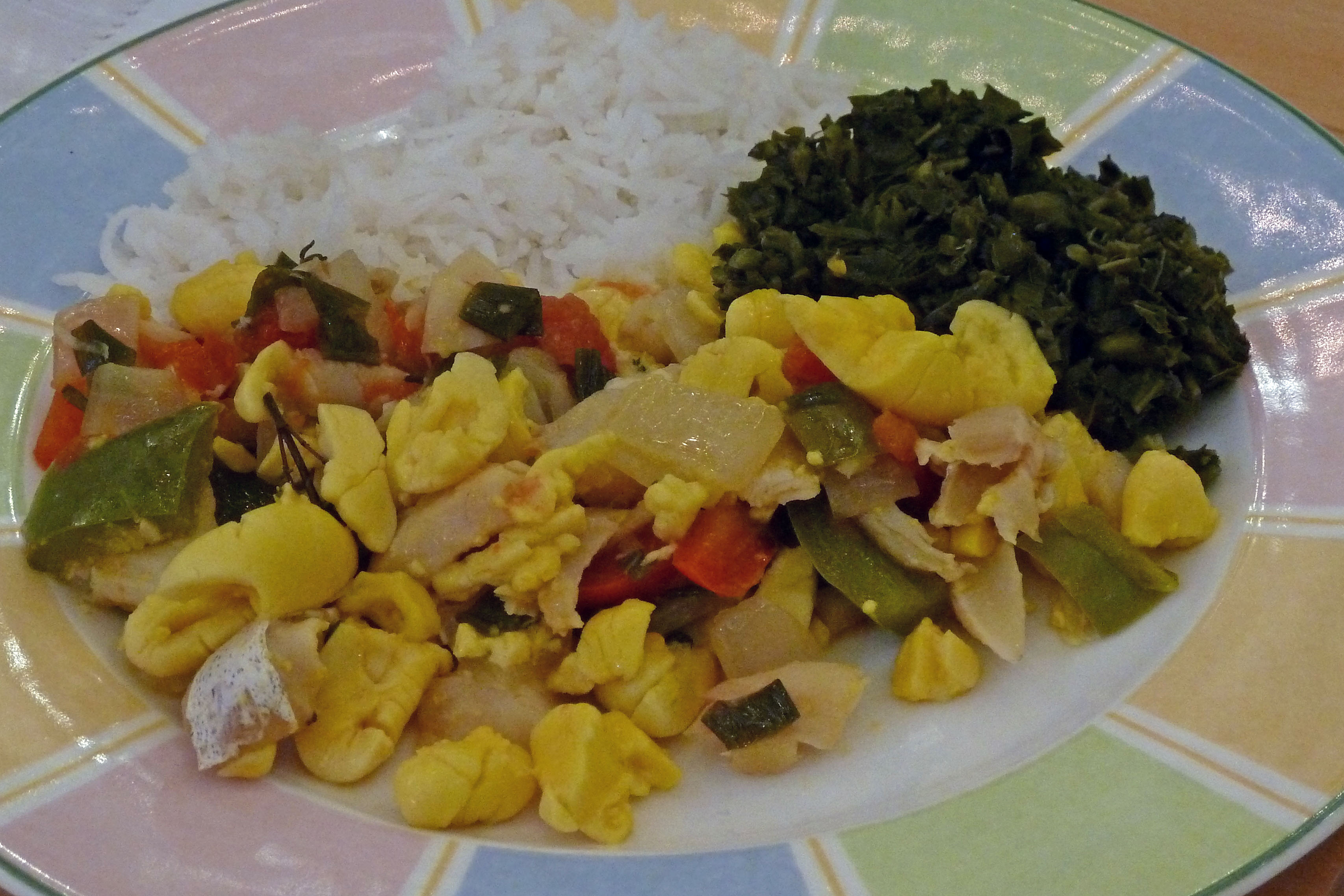 The traditional accompaniment would be rice and peas. But on this occasion we made do with just rice and a can of callaloo. The latter was a mistake and fresh would be better – it cooks just like spinach.