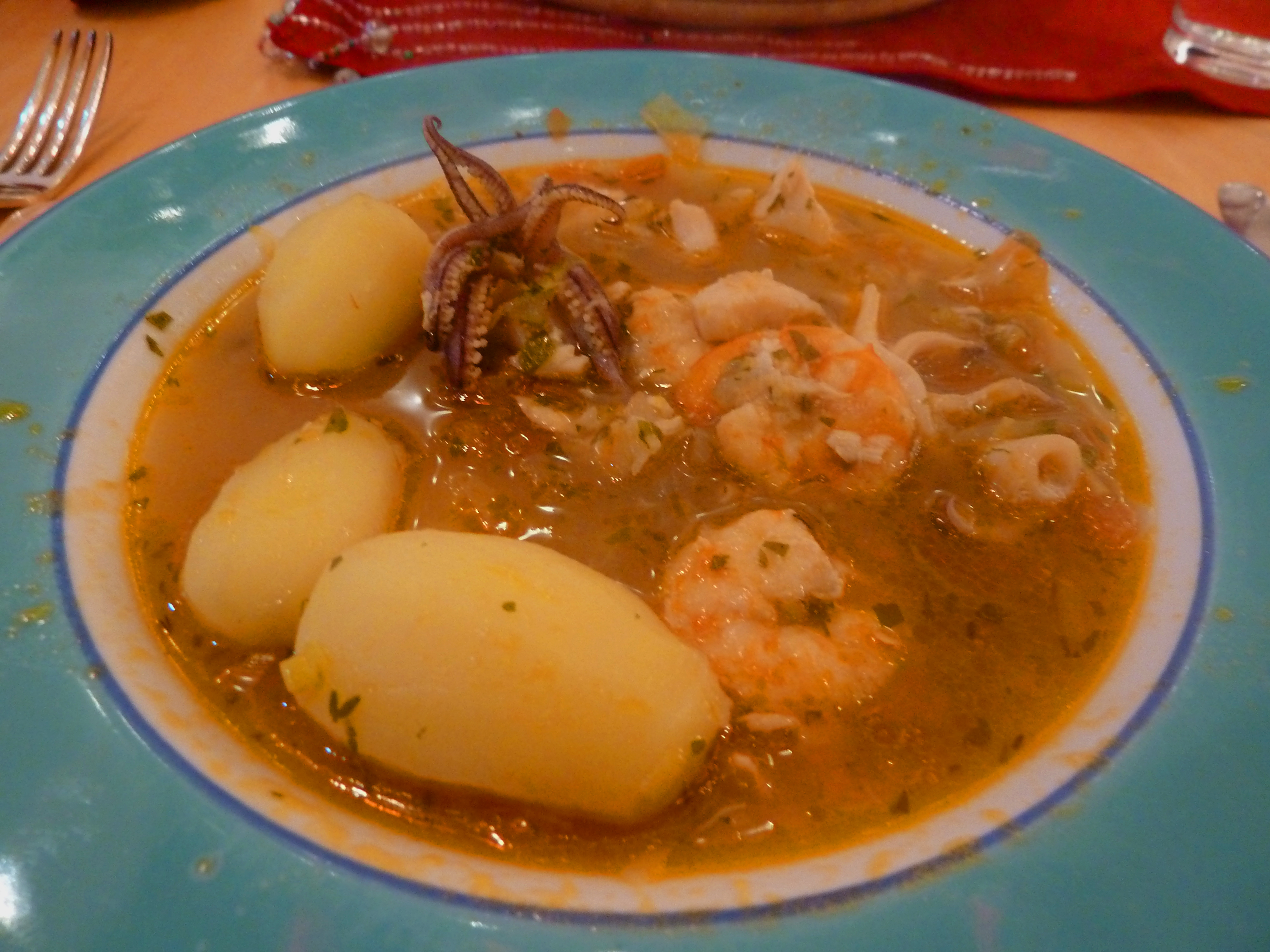 The following photograph shows a version I made without mussels, because of a guest’s allergy, but with the addition of a few steamed potatoes. There’s no point in making only a little and, if any is left over, it makes a great fish soup when liquidised, in which case I would eat all the prawns and squid first.