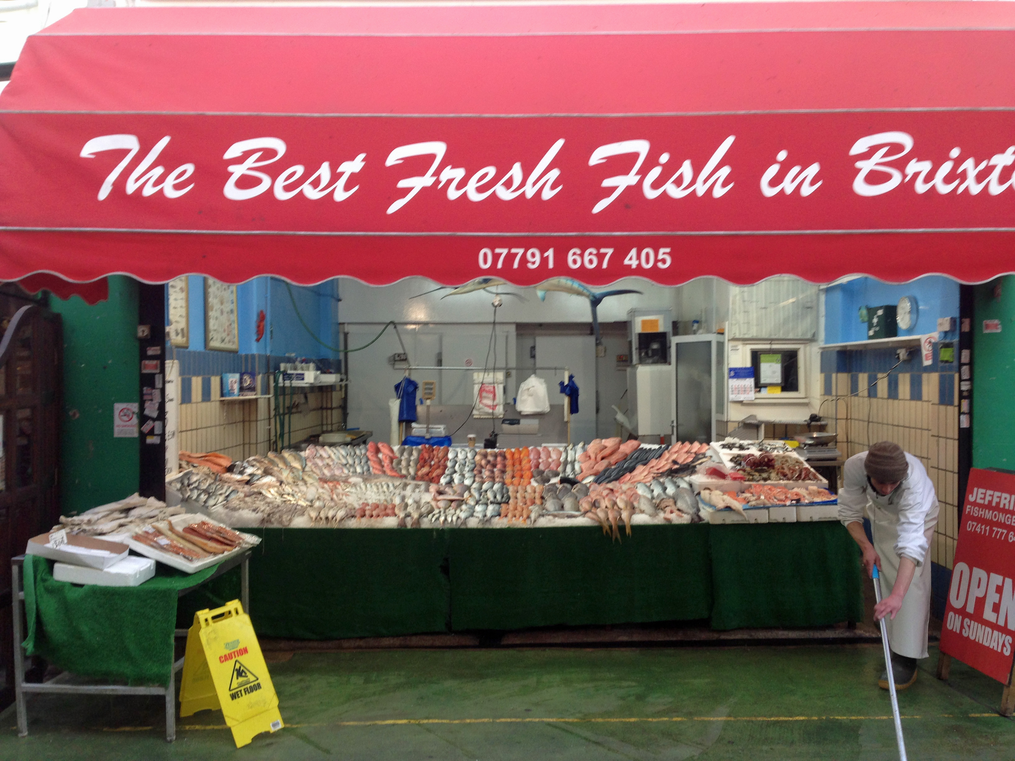 Jeffries, 5 Market Row: Just next to Franco Manca, this together with the other two in Brixton Village sell broadly the same range of fish.There was a while, a few years back, when the fish shops in the market had a relatively limited range, aimed more at the West Indian customer. But now the only reason to go elsewhere is if you want something really fancy, such as turbot, and are prepared to pay the price. In Brixton the prices vary all the while and you can’t necessarily assume that one shop offers better value across the whole range but prices here seem to be mid-range.