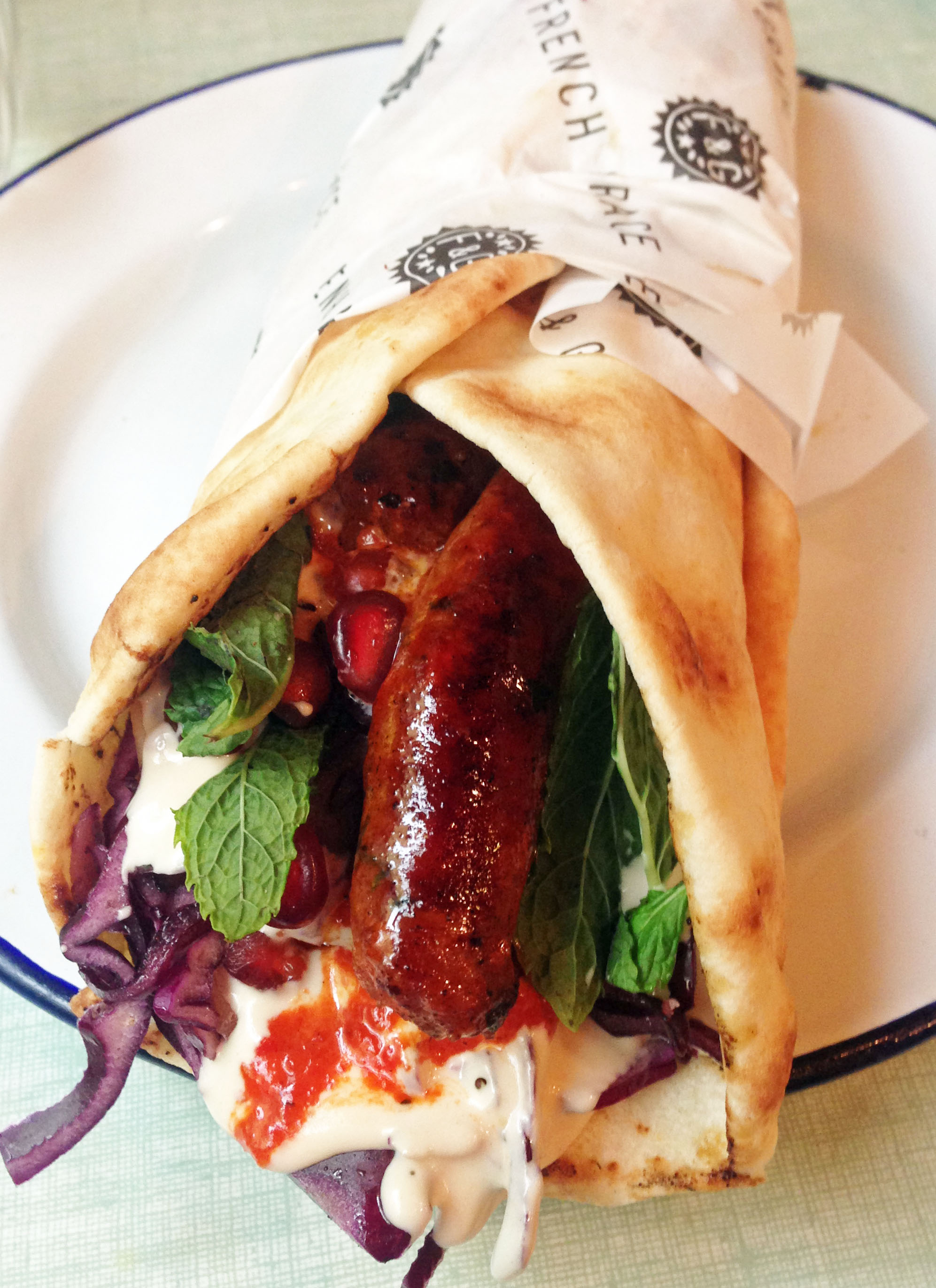 The cuisine is middle eastern with sides of chilli corn, spiced almonds and nocellara olives, among others, available while you wait. Then follows the mezze dips – butter bean and rosemary hummus (their spelling), baba ghanoush (an aubergine pate), Muhammara (spicy walnut and tomato) and yoghurt, sea salt and mint oil. Then there are the wraps including “uber wraps” of flatbread with lamb merguez and chargrilled halloumi. These are clearly popular and form the basis of their wrap shack. There are also “specials” including pea and mint fritters, crispy chicken, pea, broad bean and feta salad and panzanella (?). We didn’t have the specials brought to our attention, so we went for two dips (hummus and Muhamarra) and a lamb merguez wrap.