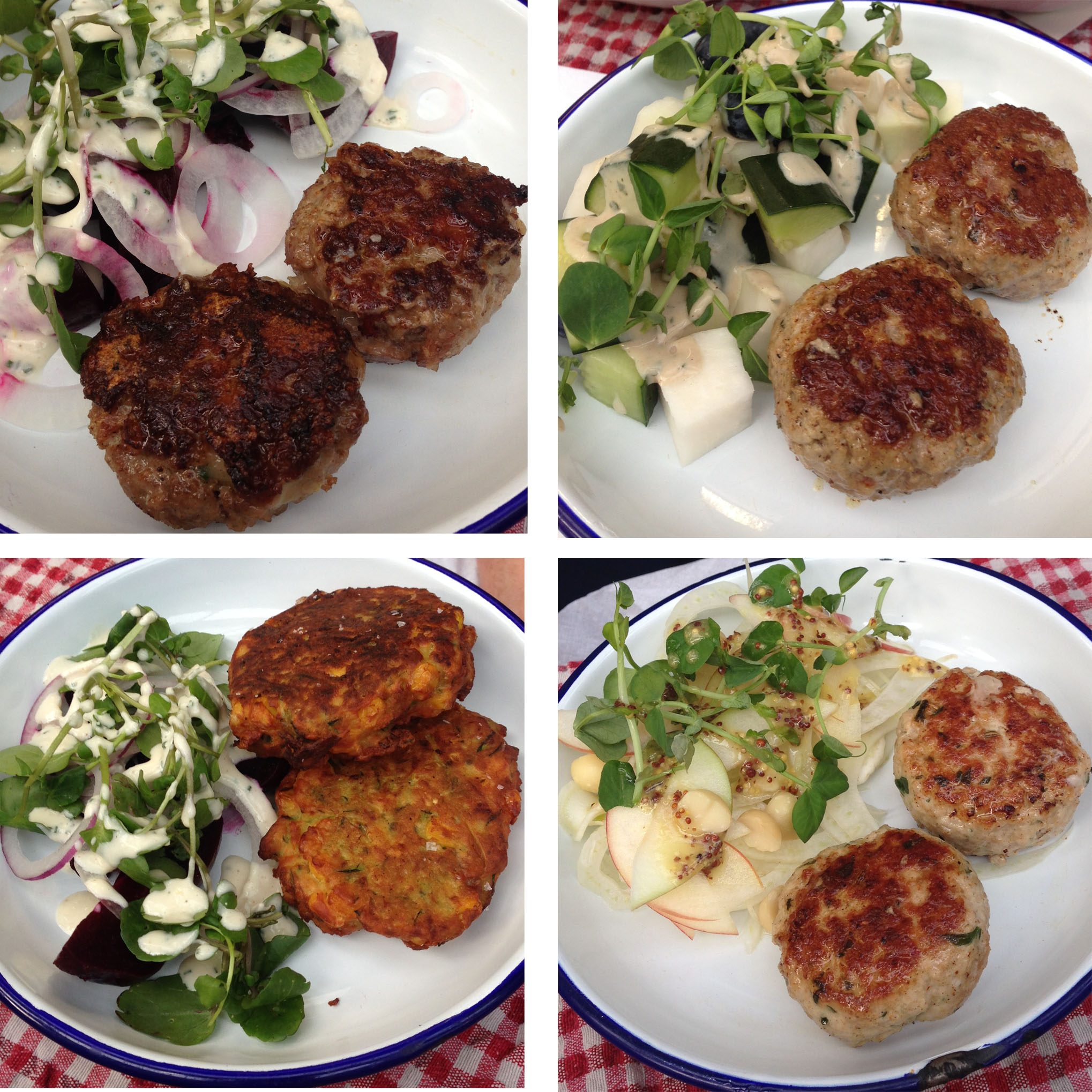 The menu is simple – its Moo, Baa, Oink or for the vegetarians Roots and Shoots. They are all accompanied by a different salad with a different dressing. There are two sides -aubergine fritters with peppermint yoghourt or sweet potato fries with pickled chilli mayo. We just ordered the lot …. although this may not be appropriate for anyone on a diet. Our favourite for both the rissole and the salad was the beef, cheddar and home smoked bacon version which was moist and easy to cut and went really well with the Pickled plot beetroot, watercress and white onion salad with a faint Beenleigh blue cheese dressing. Next best was the lamb and rosemary, which was very fragrant and came with kohlrabi, cucumber and blueberry salad with gentleman’s relish dressing. Joint third or fourth were the Pork and Fennel seed and the Courgette and Sweetcorn fritter but for completely different reasons. The pork needed a bit more salt and was very dense and the fritter was a little underdone. But this is really hair-splitting as they were all good but having everything on the menu meant we couldn’t really concentrate on any one – it was a close call for placement. The sweet potato fires were hot from the grill and the chilli may did not cool them down so beware of fingers and throats. The peppermint yoghourt for the aubergine fritters was definitely minty and came into its own when the chilli may became too much to handle.