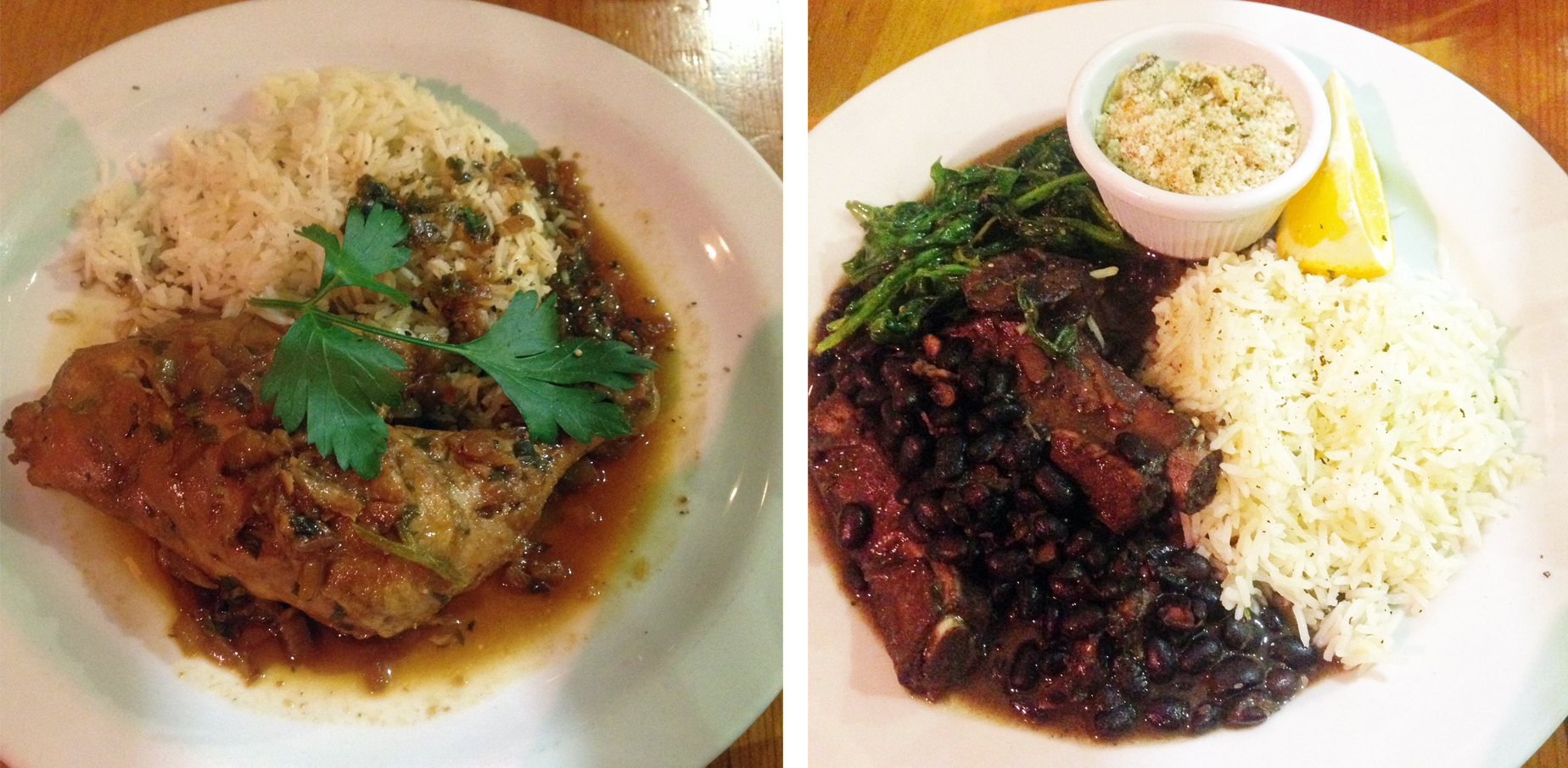 It is very difficult to make Feijoada look pretty. It looks like a cassoulet and is a dish to use up those leftover pieces of meat in a filling stew. Traditionally it is served with white rice and oranges but here it came minus orange. This dish came with farofa – according to Wikipedia this is an essential ingredient when serving Feijoada and typical recipes use raw manioc flour to be toasted with butter, salt, and bacon until golden brown. It tasted like corn and not that interesting but clearly authentic. The Chicken Caipira is again traditional and comes from the landlocked states of Brazil, especially Goiás. It consists of braised chicken which is seasoned with ginger, garlic and spring onion. The meat was very easy to get off the bone and the sauce which has coriander in it went well with the rice. But the spices were definitely subtle and perhaps a little more ginger would have made it really zingy. Portions were large but not overwhelming and there was certainly enough on each plate for us not to even consider a dessert.