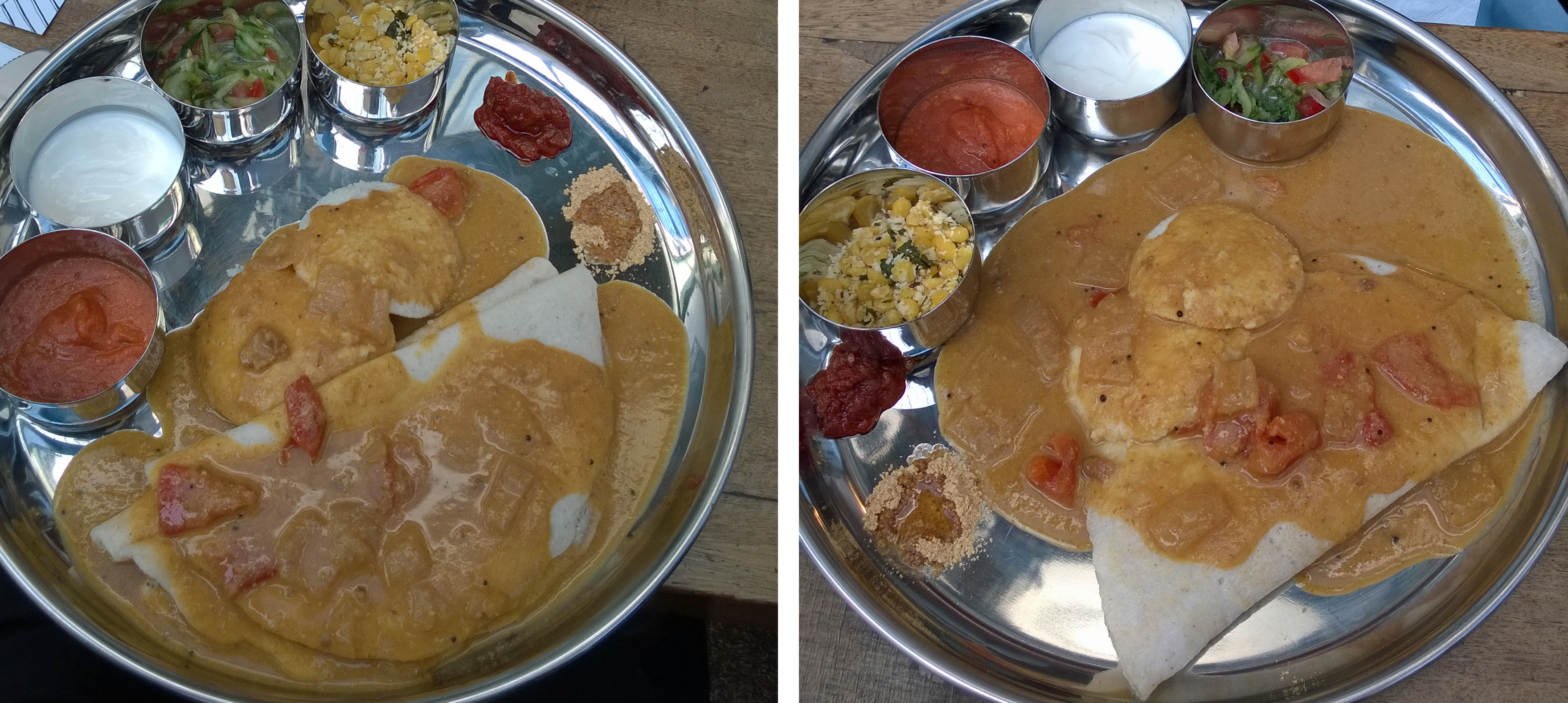 Papi’s Pickles have now joined a long line of guest chefs at Cornercopia. Appearing on Sundays Papi’s pickles offers a South Indian Sunday breakfast and brunch at reasonable times for the earlier risers and the laggards. The food is said to come from the Navaratri Festival, which means 9 nights in Sanskrit – Navaratri represents a celebration of the Goddess Amba and at this time of the year is referred to as Sharad Navaratri which is the most important festival. The reason for mentioning this is not only because the menu does but also because it comes with lots of dishes with different coloured peas and beans (black-eyed, mung chick, green moong, soya etc) which are integral to this celebration. All the food is vegetarian and gluten free or lactose free or both. There is a very limited set menu for both breakfast and lunch which offers either a coconut masal dosa with the spicy potato filling or two plain dosas. We chose one of each and shared but we advise you to have the filled ones unless you really do not like potatoes.