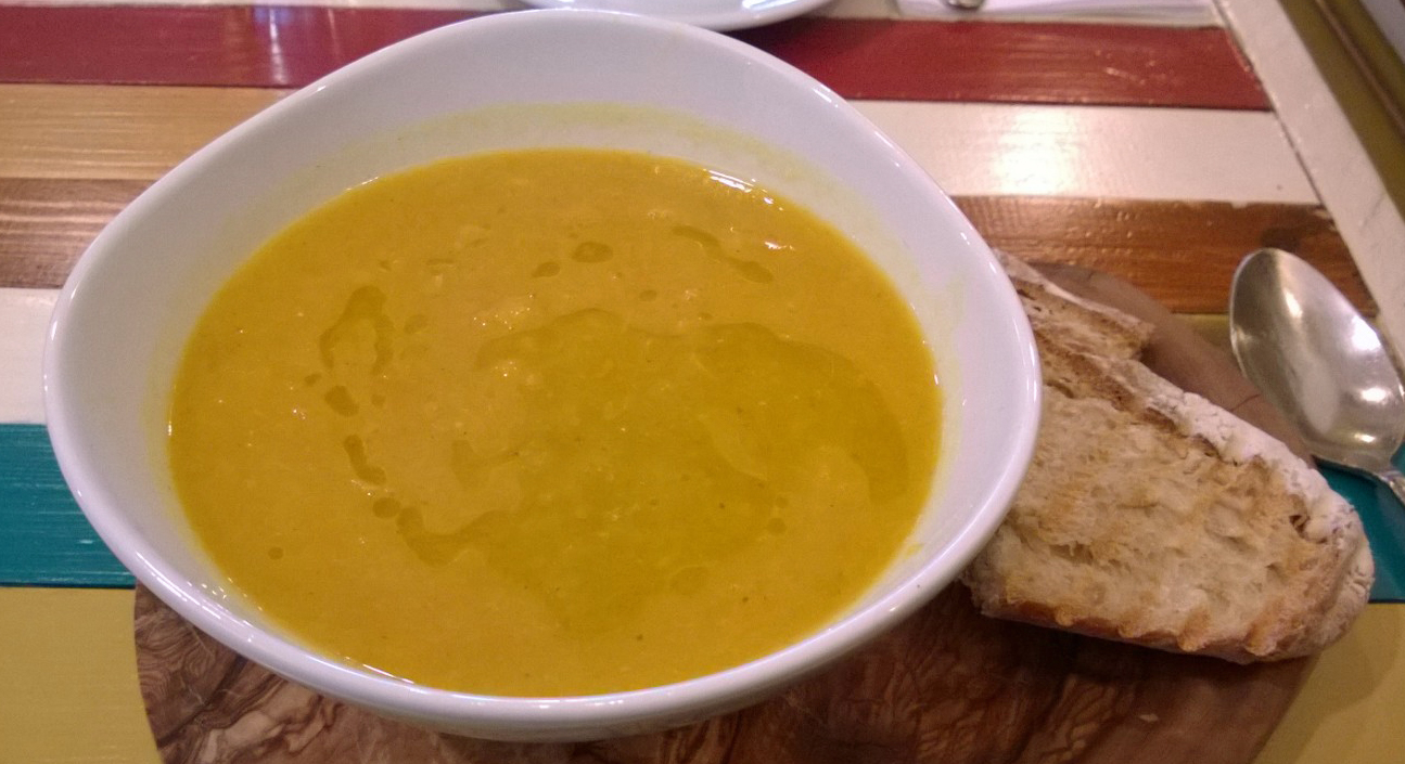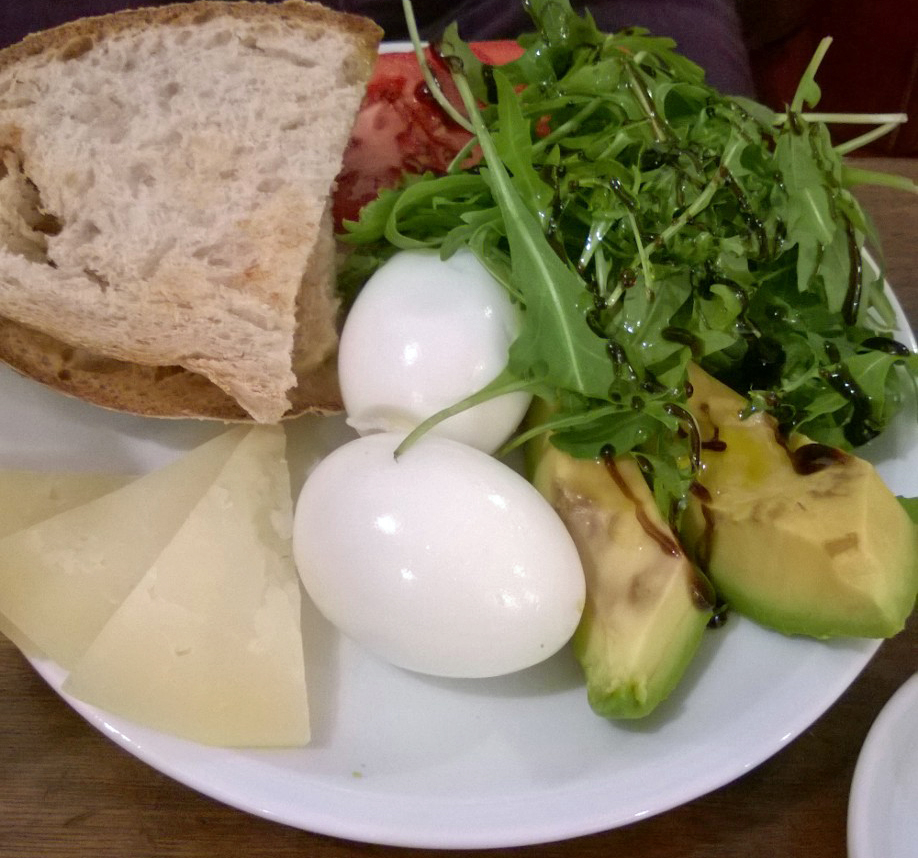 My favourite dish is the babaganoush – a sort of smoked aubergine pâté with tomato, olive oil and garlic – although it might not be to everyone’s taste. I’ve also enjoyed the Italian sausages with potatoes and peppers in a mild chili sauce. It’s worth emphasising that the mezze portions are small and like a generous sandwich filling. There are also breakfast dishes, although the only one we’ve tried (pecorino cheese, hardboiled eggs, avocado and salad) was just a bit uninteresting. In addition there’s always a soup of the day – the accurately spiced squash and lentil version was tasty, especially for a cold day. Finally, there is always the selection of freshly made croissants, brioche, cakes and tarts, all of which are made in-house. I’ve only had a nata, i.e. a Portugese style custard tart, which had just the right amount of caramel taste and I had to stop myself going for two in this January austerity month.