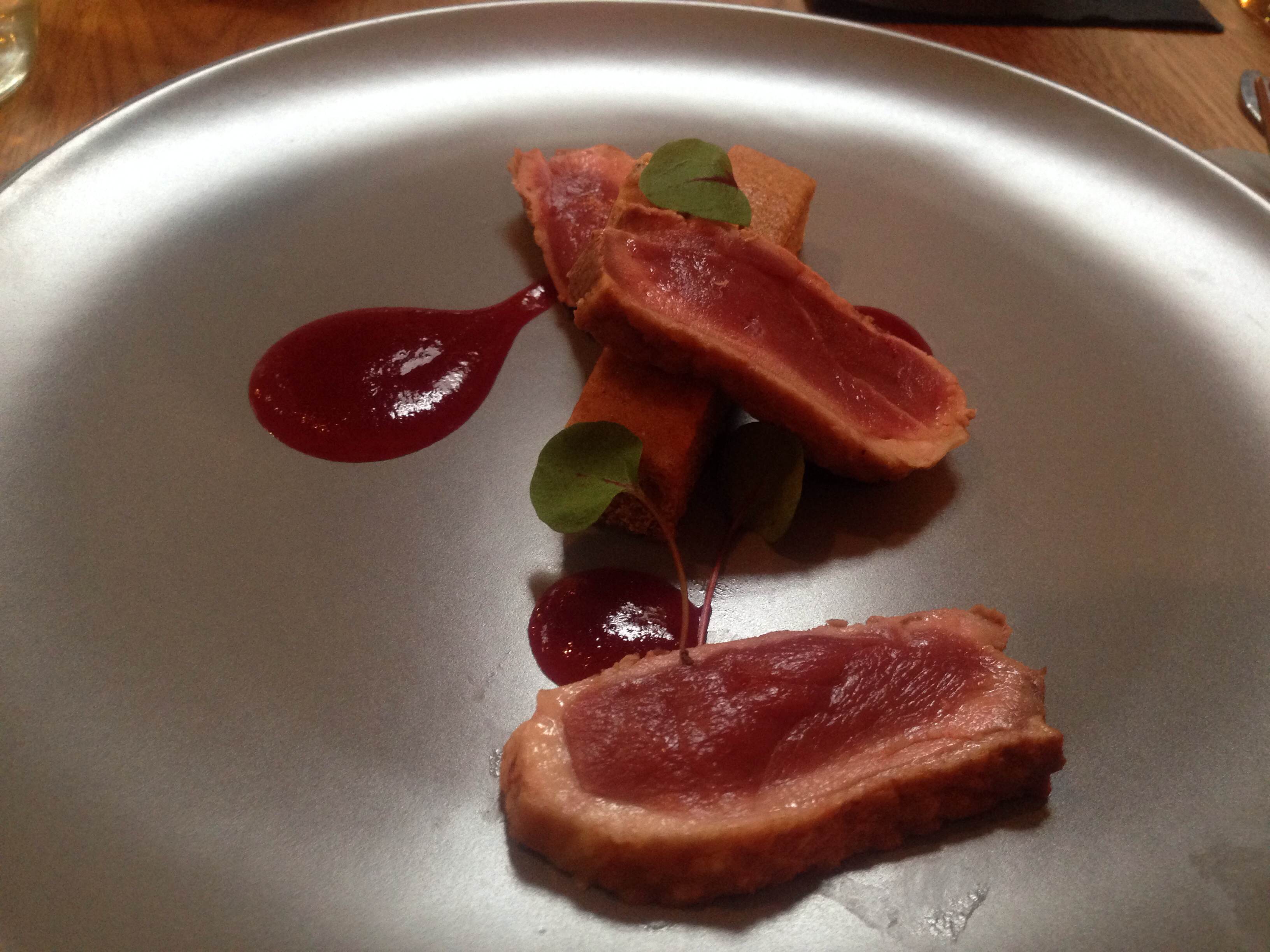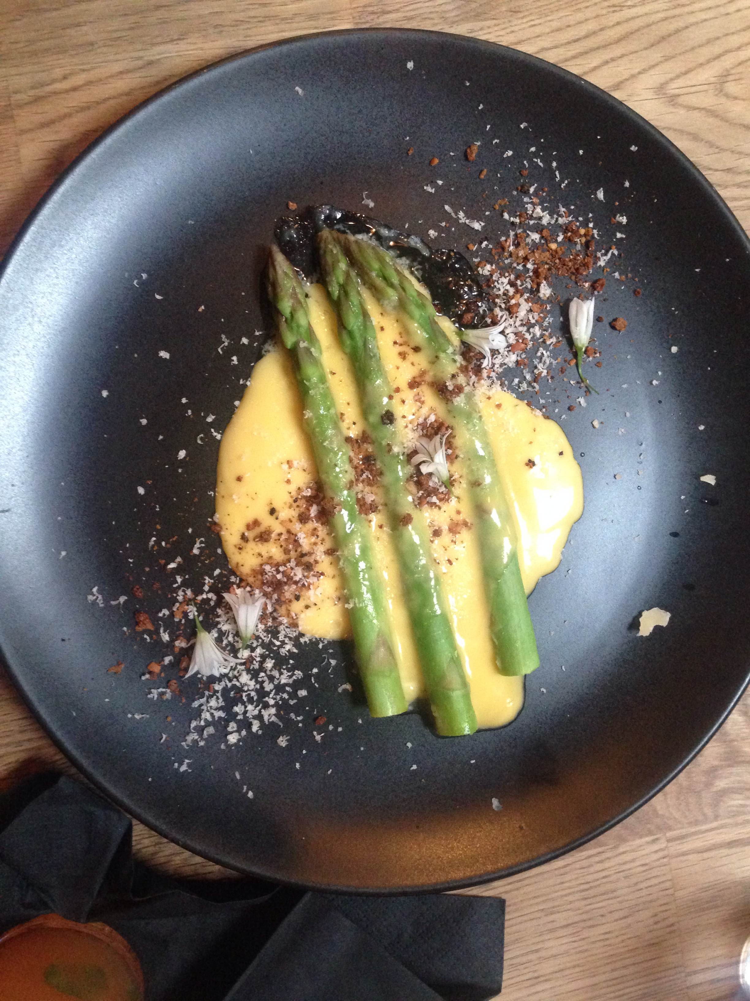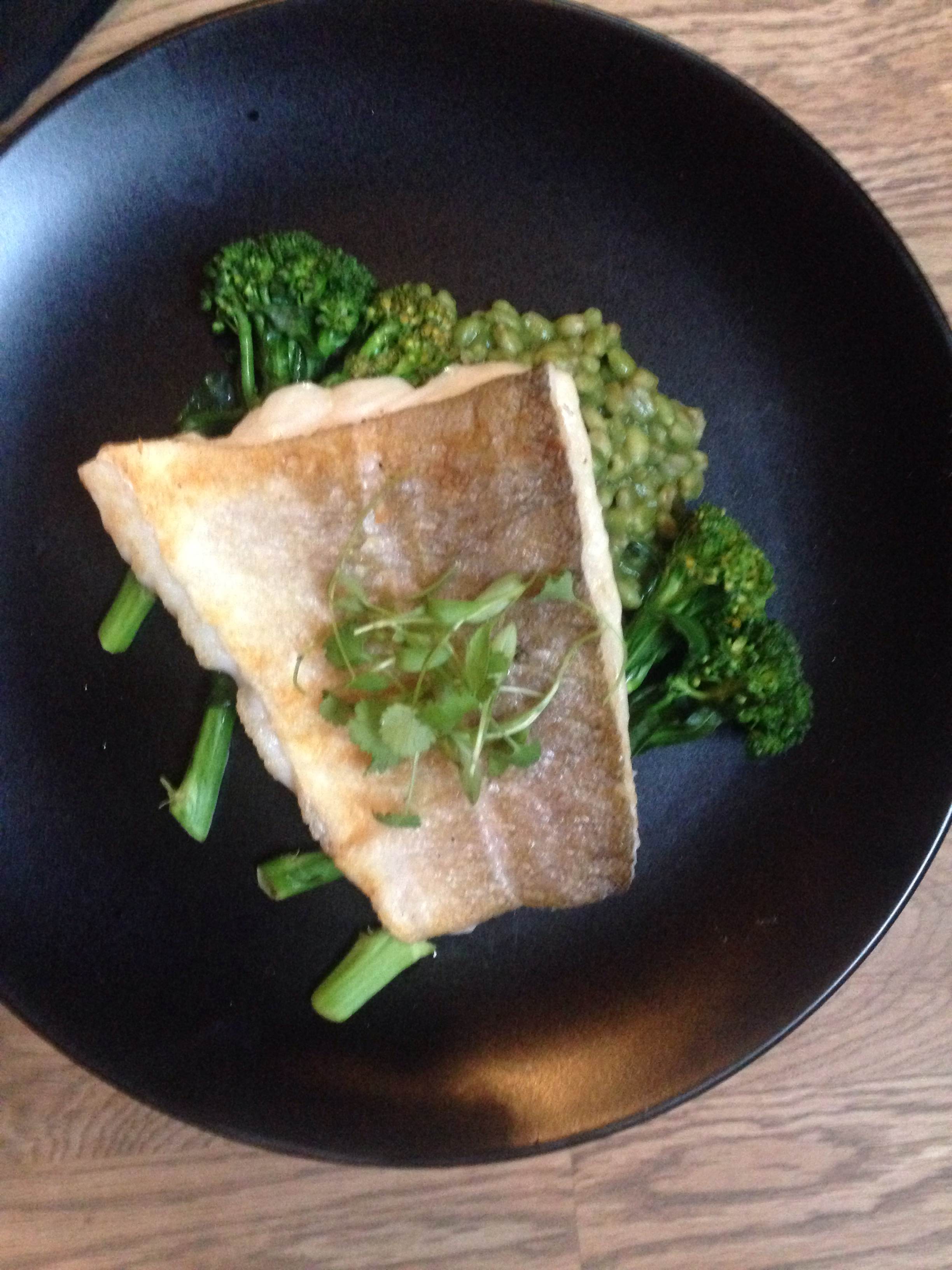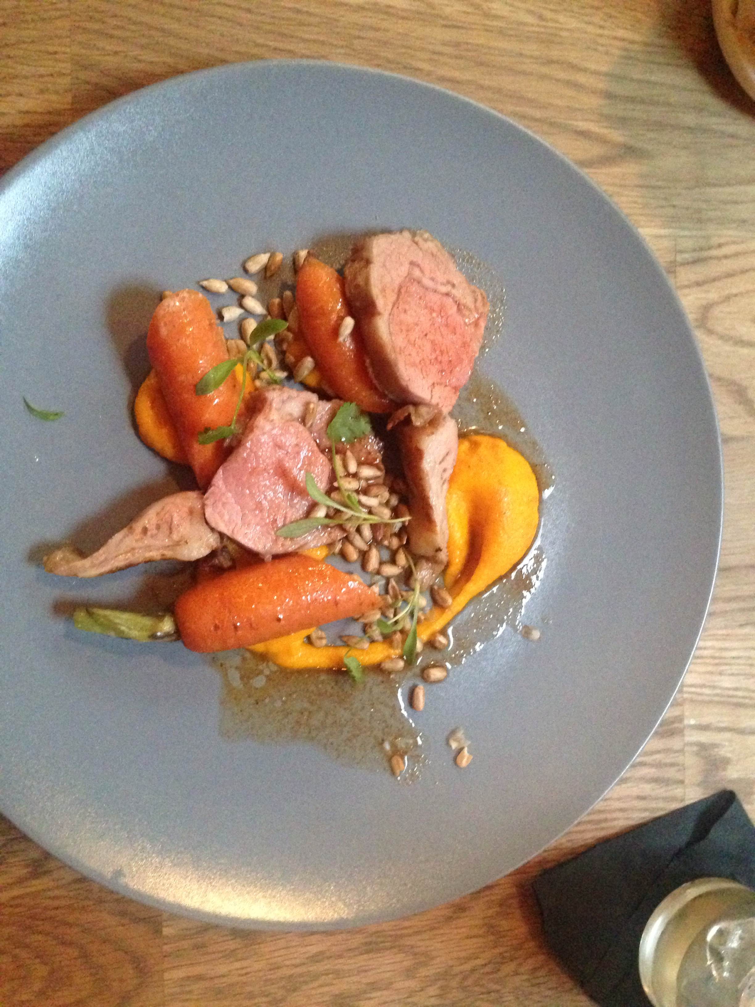 We ate from the two courses for £18.00 menu and had a glass of wine. They had a Primitivo from Italy and a Spanish white – Verdejo. We both chose duck with gingerbread and shared some asparagus. The duck was amazing, we just wished there was more of it! The asparagus was fantastic with a creamy sauce, which we had to stop ourselves from licking off the plate. Then we chose cod with barley and broccoli and the lamb with carrots. The cod was a large meaty fillet and was cooked just right. I haven’t had barley before but it tasted bouncy and the sauce gave it a bit of a lift. The young green veg was just enough to make you feel it was contributing to your 5 of the day but only just. The lamb and the Primitivo complimented each other perfectly.