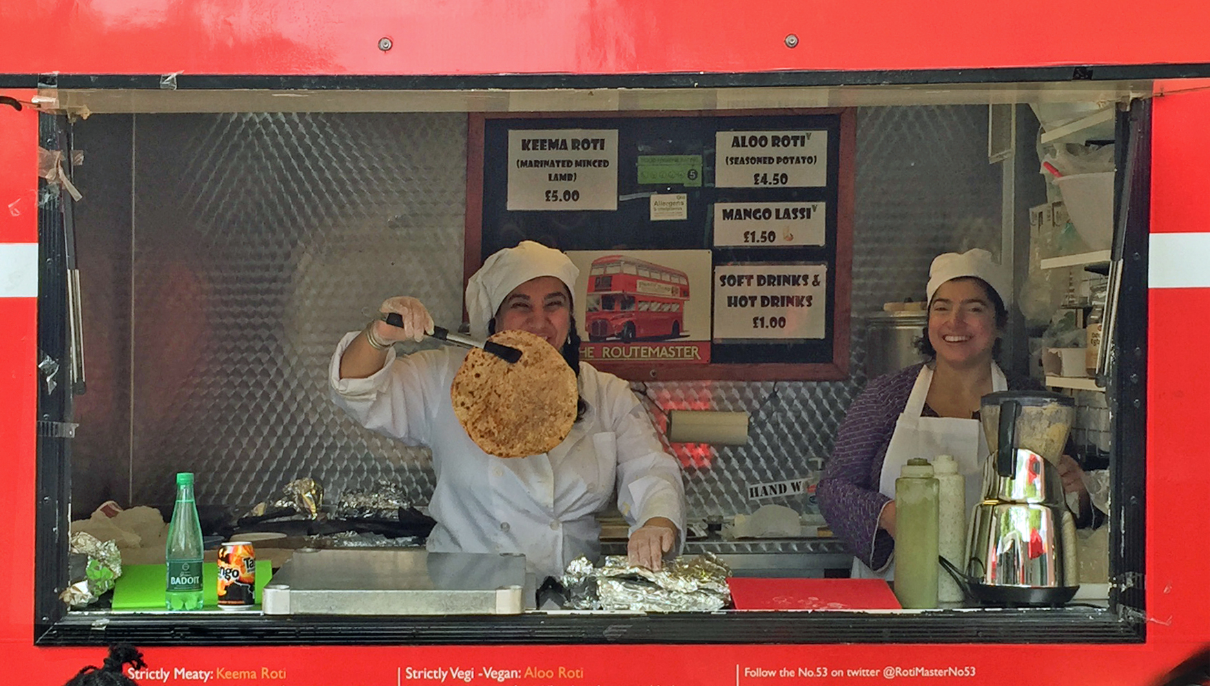 I ate an Aloo Roti (the veggie option of potatoes with a minty yoghourt dressing and one chili and coriander which was very hot). This came from the No 53 stall which has a bus on its logo. While I was waiting I learned a lot about skill development as one of the customers was receiving good advice from the chef about local options of courses. My partner chose lots of meat and some vegetables from another stall.