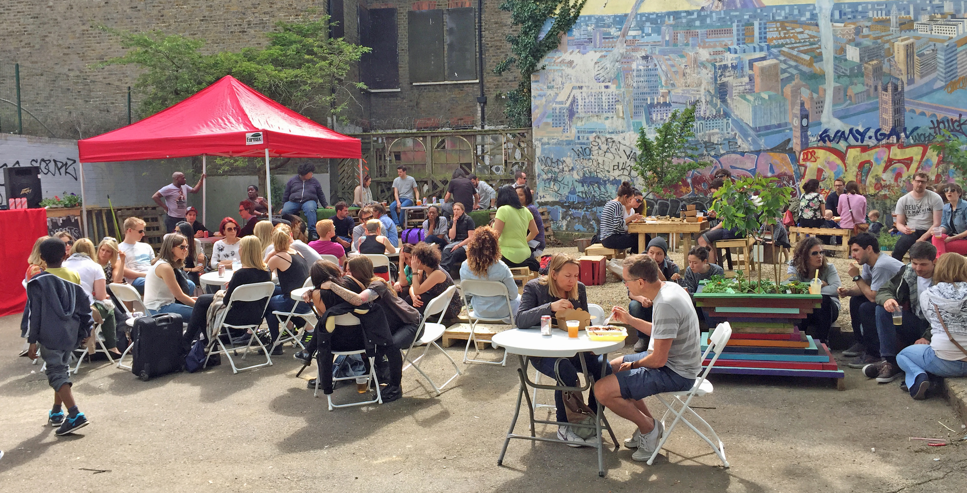 We visited on both a Saturday lunchtime and Sunday afternoon. There were about 6 food stall and two selling local beers and a lot of tables and chairs – a much better option than outside the Ritzy where there was nowhere to perch except some steps. It was of course sunny on our visit and all these open air venues look different under a grey sky but it was pleasant and well used. But we can’t say what food stall you will get as they changed between each visit.