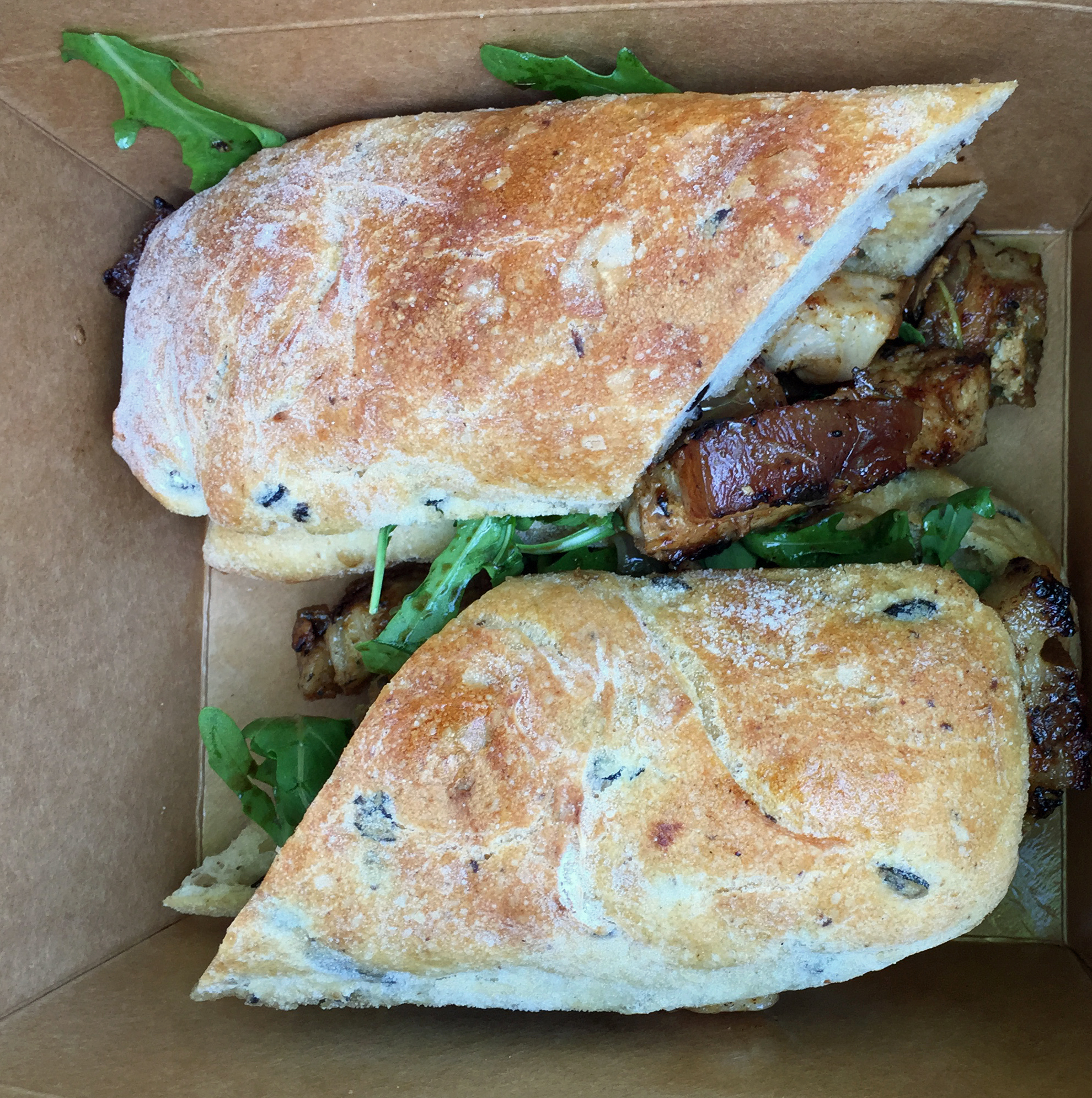 Definitely the best food came from the caravan selling burgers and other meat dishes. I chose belly pork with rocket and onion marmalade in an olive ciabatta. Not only was this enough for two but was a cut above everything else on offer. All meals are cooked to order and your Monterey jack on the burger is flamed to make it melt. They offer bacon and chili sauce as well as tomato. We will definitely revisit and, as the burger truck was around on both our visits, our readers should try it too.