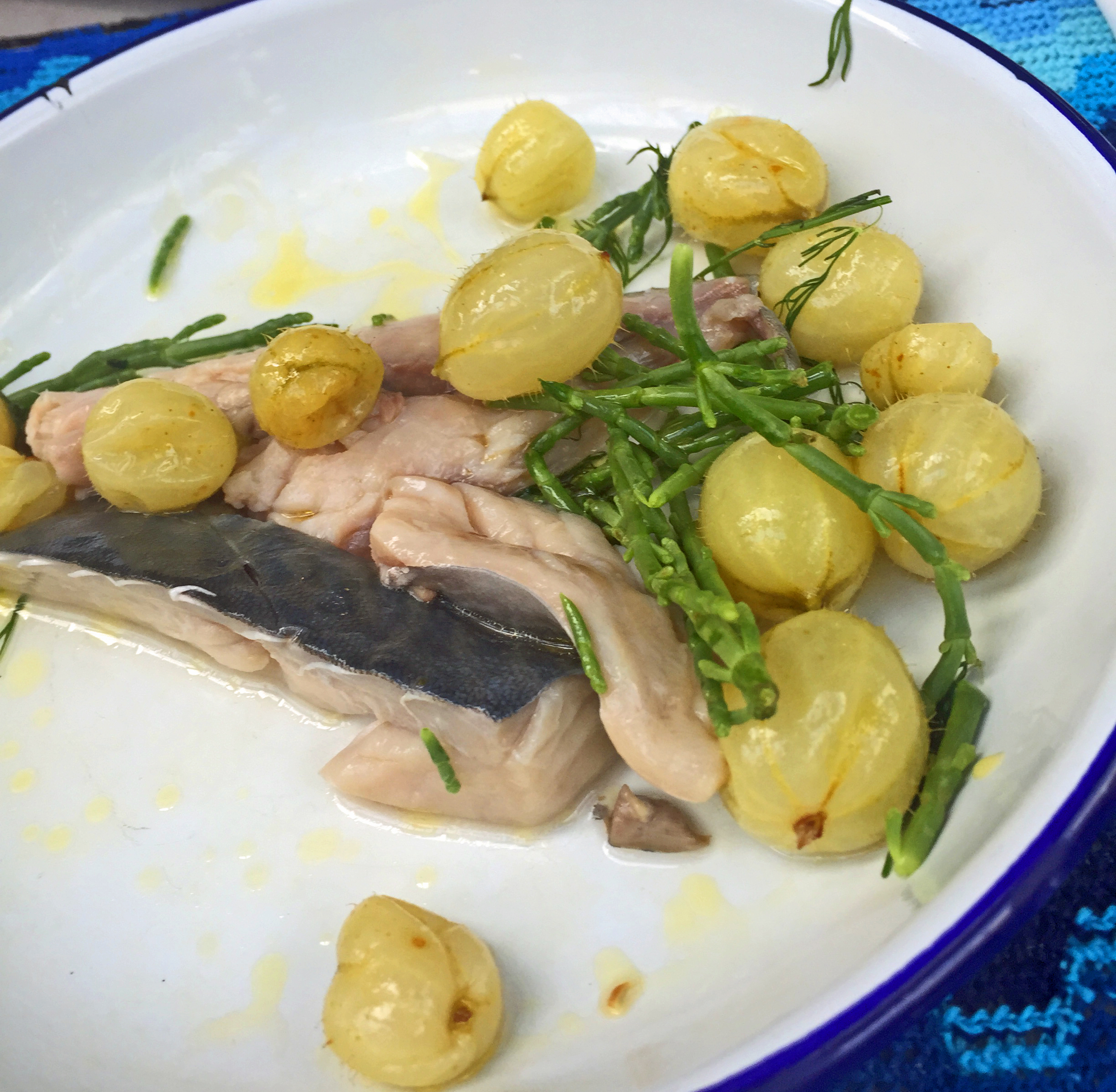 This is an easy restaurant menu – three starters, three mains, one dessert and a cheese option. When we visited in July (and they plan to change them monthly) the starters were chicken BLT, mackerel with pickled gooseberries and samphire) and a veggie option. We chose the mackerel between us and it was really interesting and (as we were not starving) plenty for the two of us. Saying it was interesting might suggest that we couldn’t decide whether we liked it or not but we definitely did and would have happily had a larger portion for a main.
