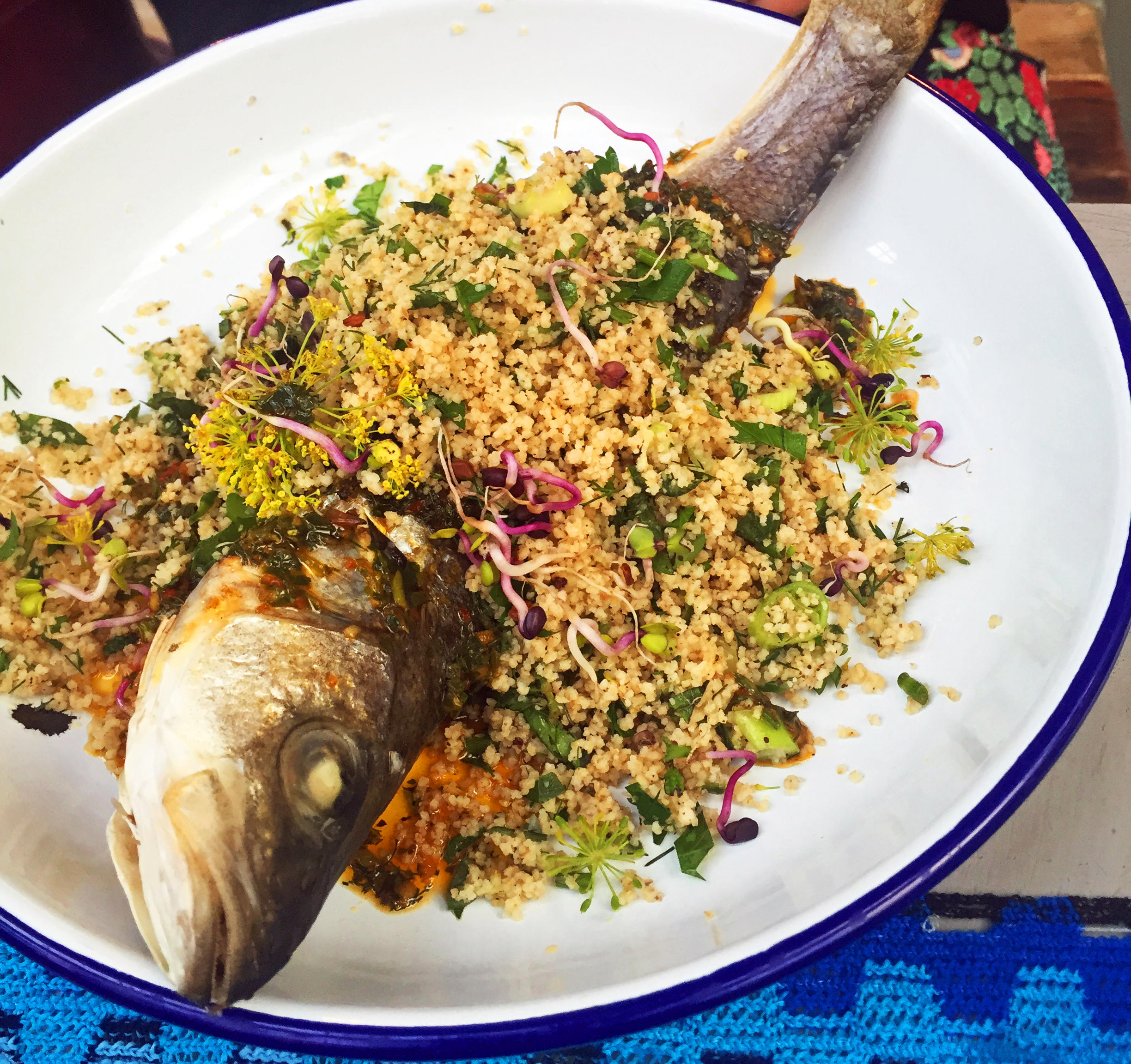 The fish came whole on a plate not really big enough for dissection. They use the same enamel bowls they sell in their shop. I was given a separate dish to put the bones in but it still meant being very careful, warily chewing every bit slowly – probably good for the digestion but not for the enjoyment of the dish. The tabouleh/couscous was very good and a shame it wasn’t part of the veggie dish. The fennel was soft enough but gave a bit of texture too.