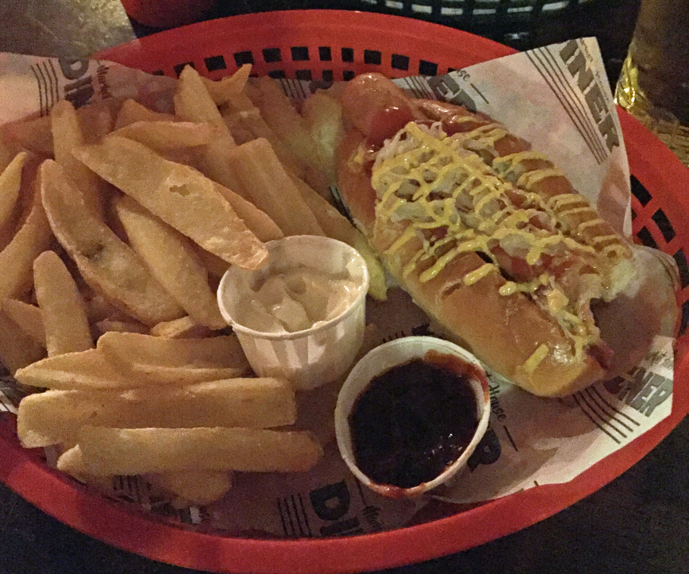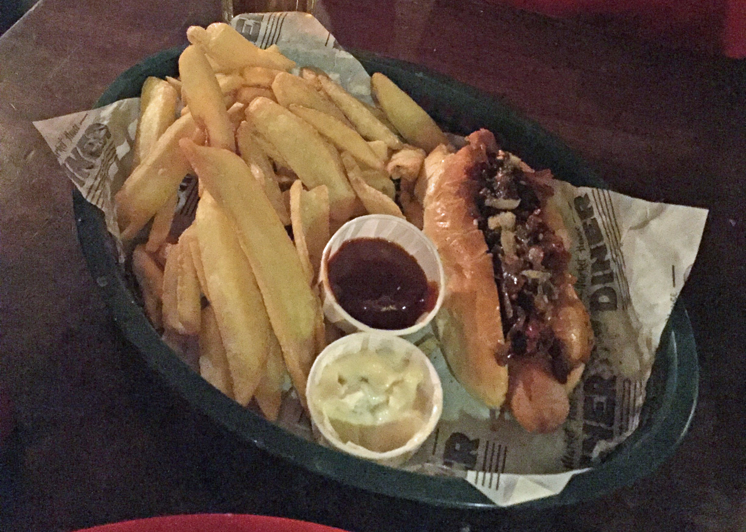 The meal deal is good value – £10 for a hot dog and a drink. We had beer. The bill should have come to £20.00. Next time we will have the beer battered pickles.
