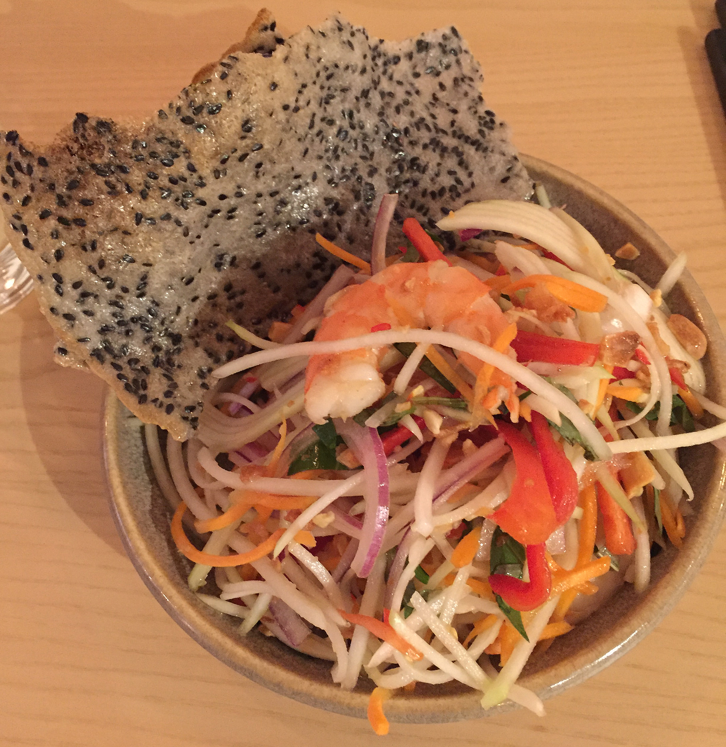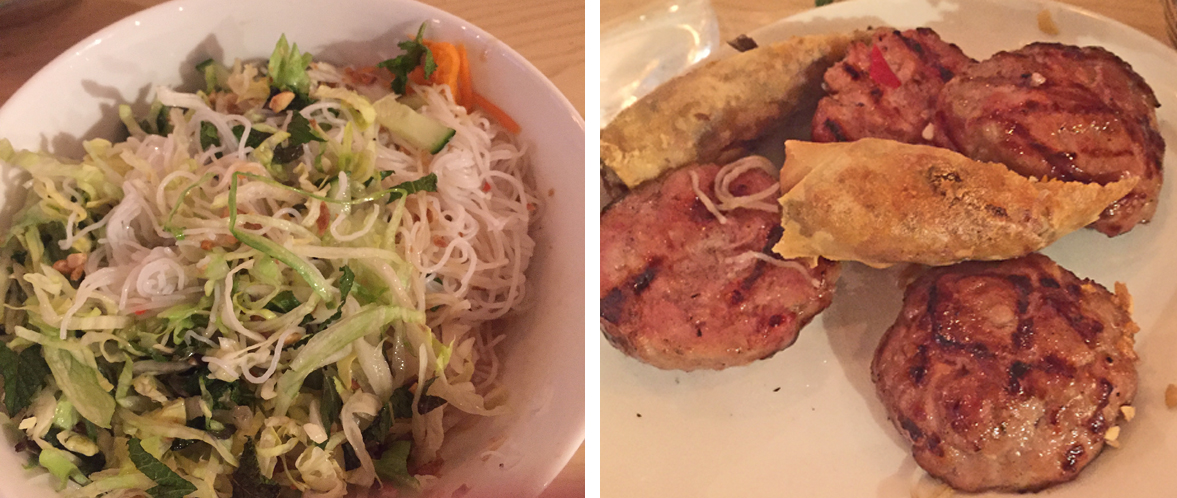 The menu is short with dishes described as smallish, biggish, classic and side orders. We ordered from the biggish (Banh Khot pancakes) and the classics (Bun Noodle Salad), with a smallish (green papaya salad) to start.  The salad was delightful and not that smallish. It comes with large prawns. We had a good explanation of the ingredients (prawns, carrots, unripe papaya, red pepper, red onion etc., with some fish sauce and chilli). To keep the papaya crisp you have to plunge it into iced water and you can buy them (they are white fleshed) at Chinese and Asian supermarkets.