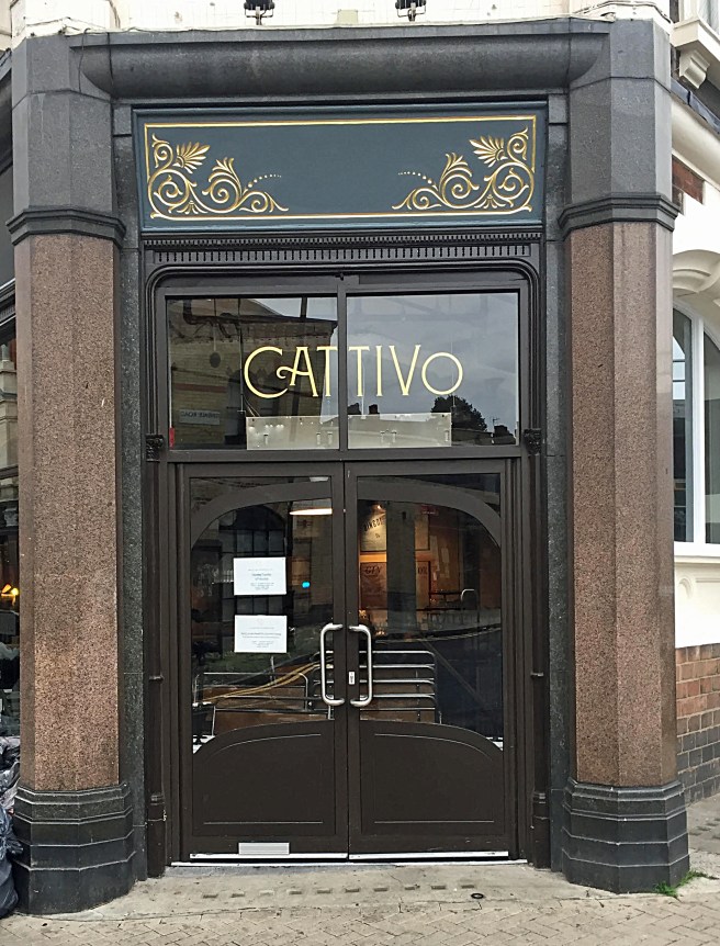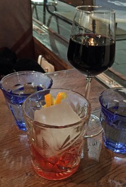 We washed all this down with water and a glass of Primitivo and a Professore cocktail (Del Professore Madame gin, Kamm & Sons aperitif, Campari) – so a sort of Negroni with a large ice cube and we were glad to see the absence of a straw. A clever engineering touch was the shaved orange peel jammed into the side of the ice cube thus successfully preventing it from freezing your top lip during drinking. We would like to congratulate the barman (or woman) who invented this – patent it now.