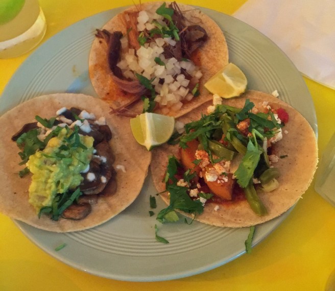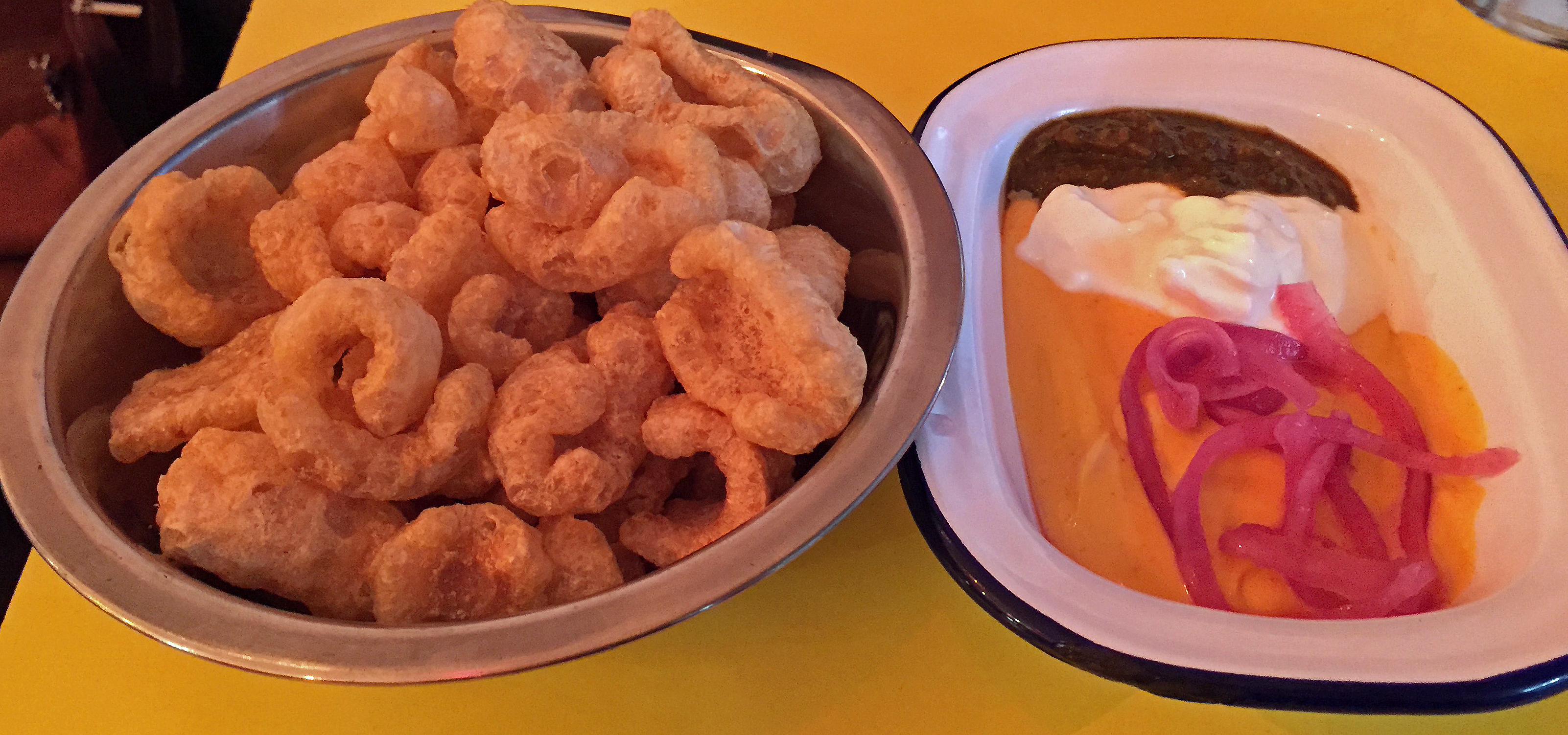 It has a blessedly short menu of Tacos and sides with a vegan option. The focus is on with slow roasted meats so this isn’t your usual slop on some hot sauce type of taco; each is meant to taste great. There are four types of taco with chicken, sweet potato, beef or mushroom base; and two sides guacomole or fermented chilli aged queso with either taco chips or chicharron (pork scratchings). We ordered three tacos (not the chicken) and chicharron with the queso.
