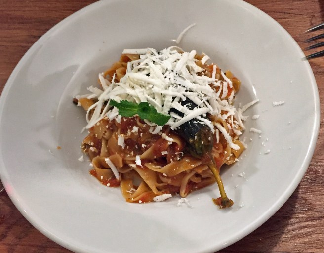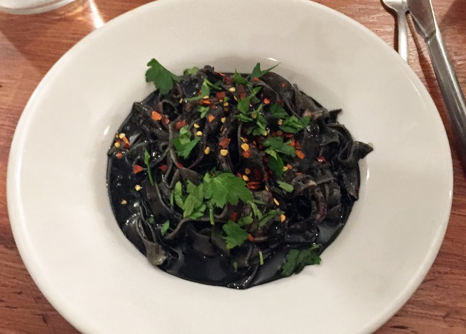 When we had finished this mini feast we were both quite full, but we were already committed to two plates of pasta. They allow you to share everything so we could have ordered one (if we could agree on the sauce). I chose Ammuttanata (stuffed baby aubergines) and my companion chose Nero di Sepia (calamari and black squid ink). We enjoyed both of them, but beware of the chili in the calamari dish as they don’t warn you and it is fierce.