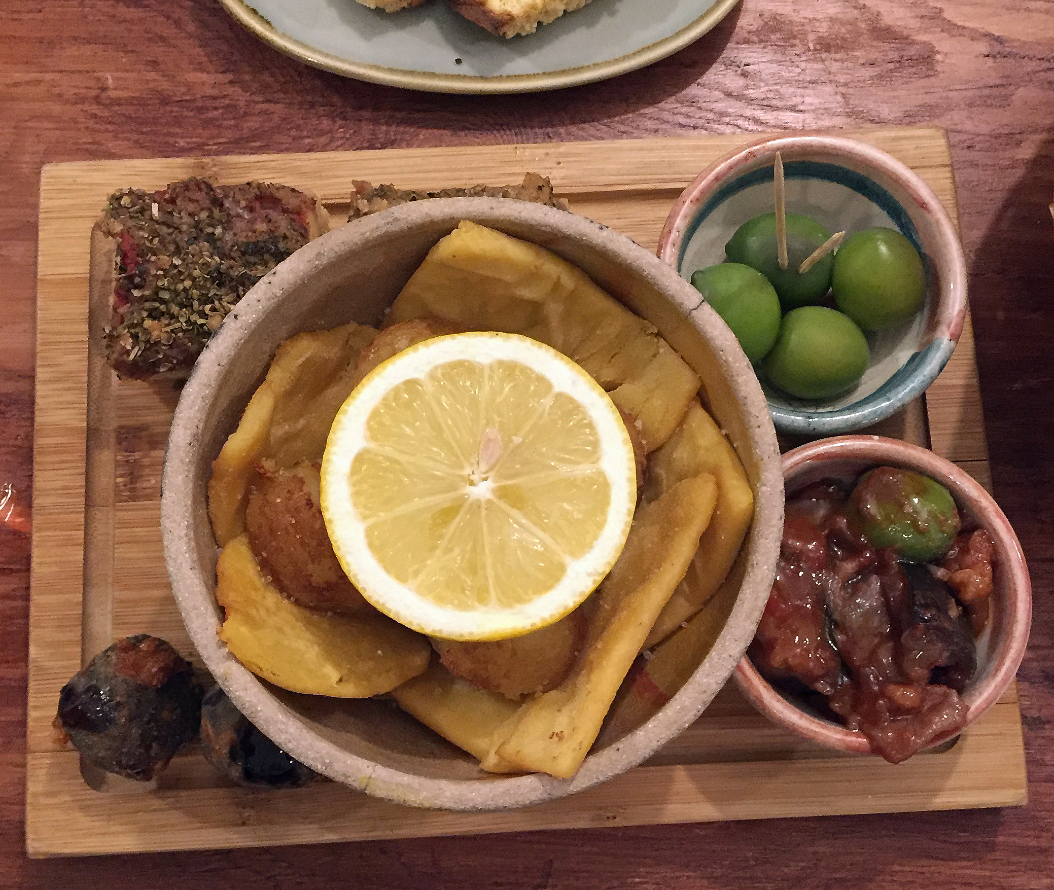 The menu is on a hard board so isn’t changing fast, although there are a few additions on the blackboard. The small plates are an array of rice balls (arancini), potato balls and aubergine balls with raisins as well as mussels with clams, prawns and octopus. They are all actually quite substantial. We chose a tasting plate so we could roam around without having to make a choice. The delicacies came hot and cold. The potato croquettes with chickpea fritters were delightful especially when you dipped the fritters in the aubergine, tomato and mint sauce. The foccacia is homemade and the dish we enjoyed was the cold Sfincione which had a topping of cheese, tomatoes anchovies and onions. Olives were large and juicy and the caponata salty.