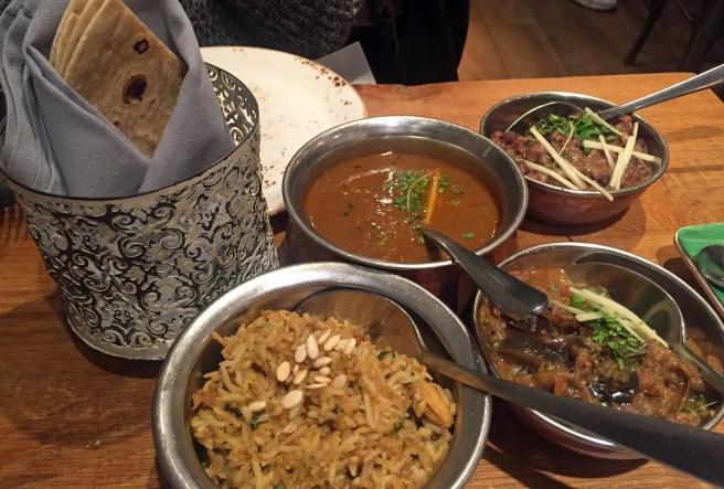 They claim to offer “light, fresh and healthy meals”, with no butter or cream, so there are several dishes described as vegan. The menu is split into small plates (pakora, chaat, samosa and masala calamari), braised and stewed dishes (curry, dopiaza, masala, muttar – all with meat or fish), grills, vegetables (bindi, daal, aubergine etc cooked in interesting ways) and bread and rice.