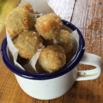 We started as we meant to go on with deep fried goat’s cheese stuffed olives. Hot and delicious.