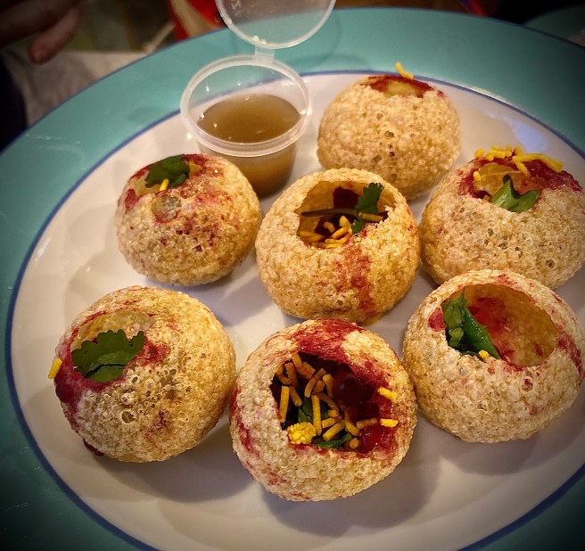 We chose the pani puri (one bite explosions of light mini baskets filled with beetroot, onion, chickpeas and pomegranate) with a little pot of tamarind sauce. From a random sample we found that the best way to eat them is to pour a little tamarind sauce into the basket and then pop into your mouth in one go. Don’t pour the sauce onto the plate as it just makes the bottom too soggy and the filling drops out. Delicious to get the taste buds working.