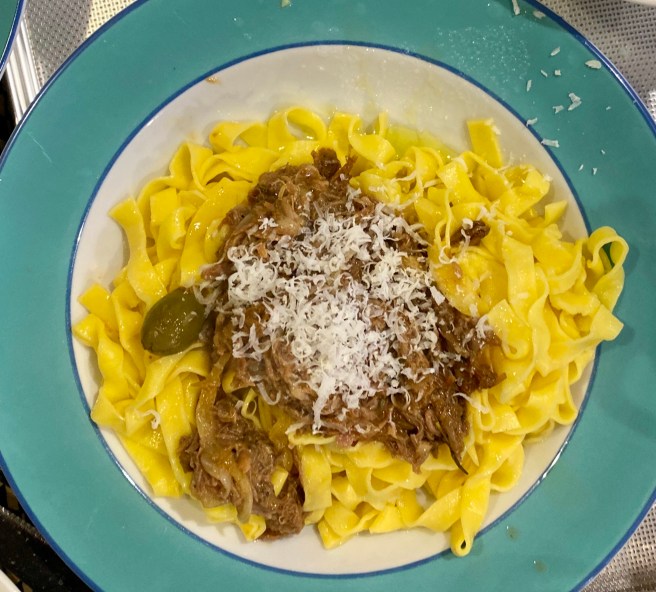 Next we chose Lamb and green olive ragù and to go with it tagliatelle, so that the pasta would catch the sauce. This was a tale of two portions. The first was very dry, little sauce to coat the pasta – we ate this one with many slugs of wine. But while we had ordered a portion each, the one was enough. But then, when we had the second portion on another day, it was much looser and tasted great. So lesson for us was to check the separate containers and for Maremma – look carefully at your portion quality control. Again we added salt – which I should say we do not mind. You can always add extra, but you can’t take it out.