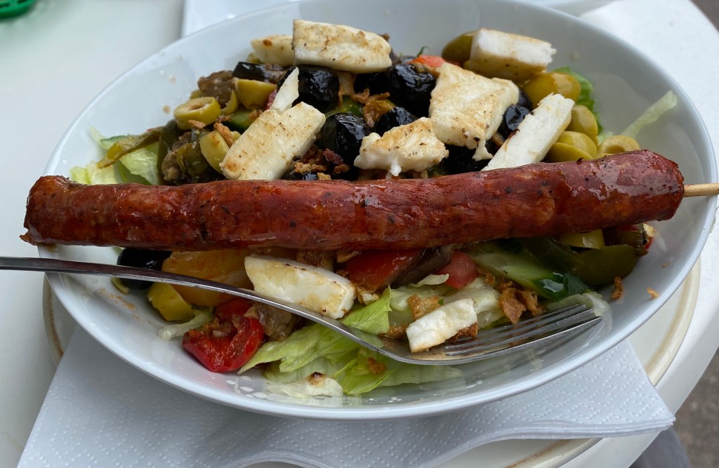 So, unlike many of the evicted Arches businesses, they’ve actually returned and a good thing too. The inside is smaller than before but currently, of course, you sit at the tables and chairs in the street. It’s always been a lunchtime stalwart and once again they delivered. I had a North African salad plus a grilled merguez sausage. The sausage wasn’t really necessary as, although I’m not normally a fan of halloumi, this was great. I particularly liked all the salty black olives.