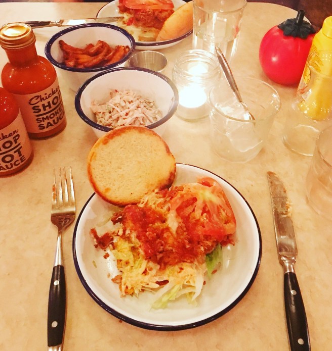 We chose a Hot dog (with tomato, mustard and pickle), a bacon burger (with pickle and relish), one portion of chips (sorry fries), a soda and a malted vanilla milkshake. Drinks come first, so beware of the milkshake which while absolutely delicious can fill you up before the main event. In terms of calories you are likely to expend more on sucking through the paper (!) straw than take in from the drink.