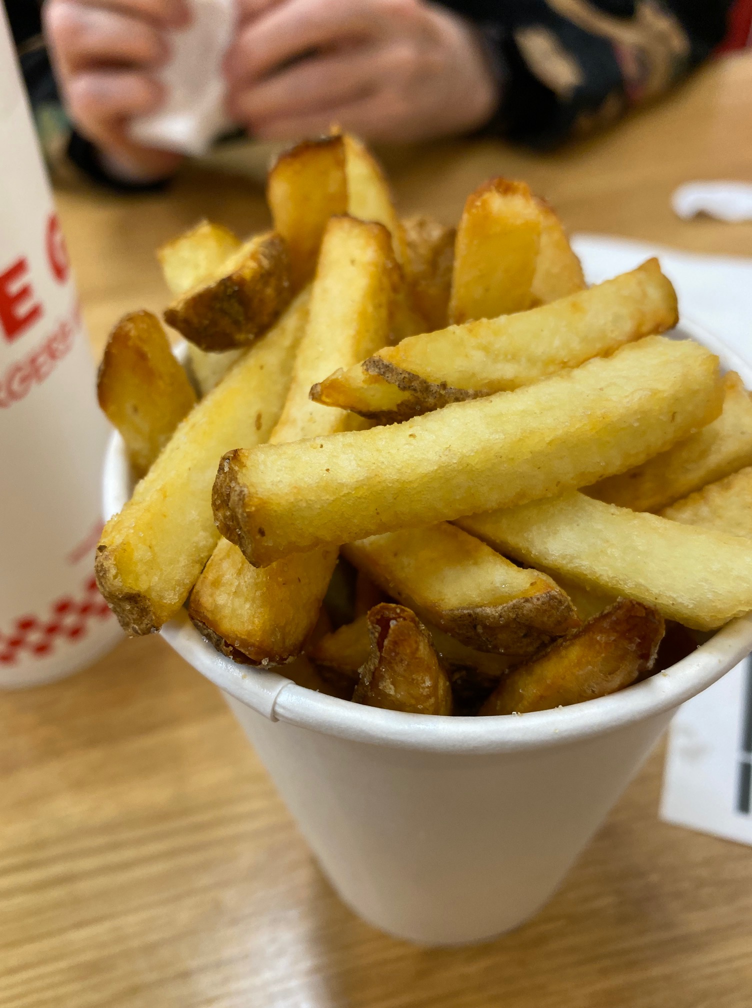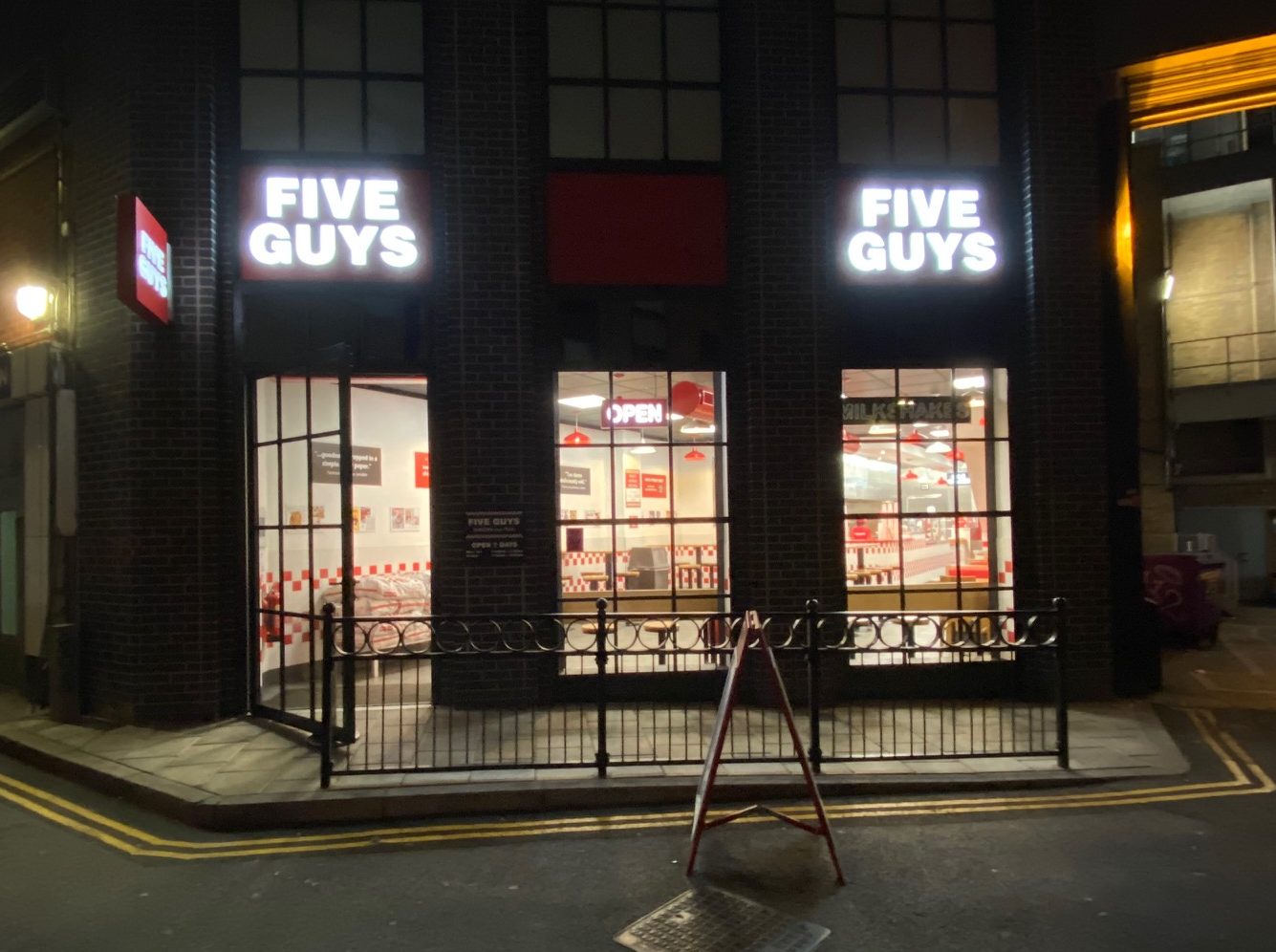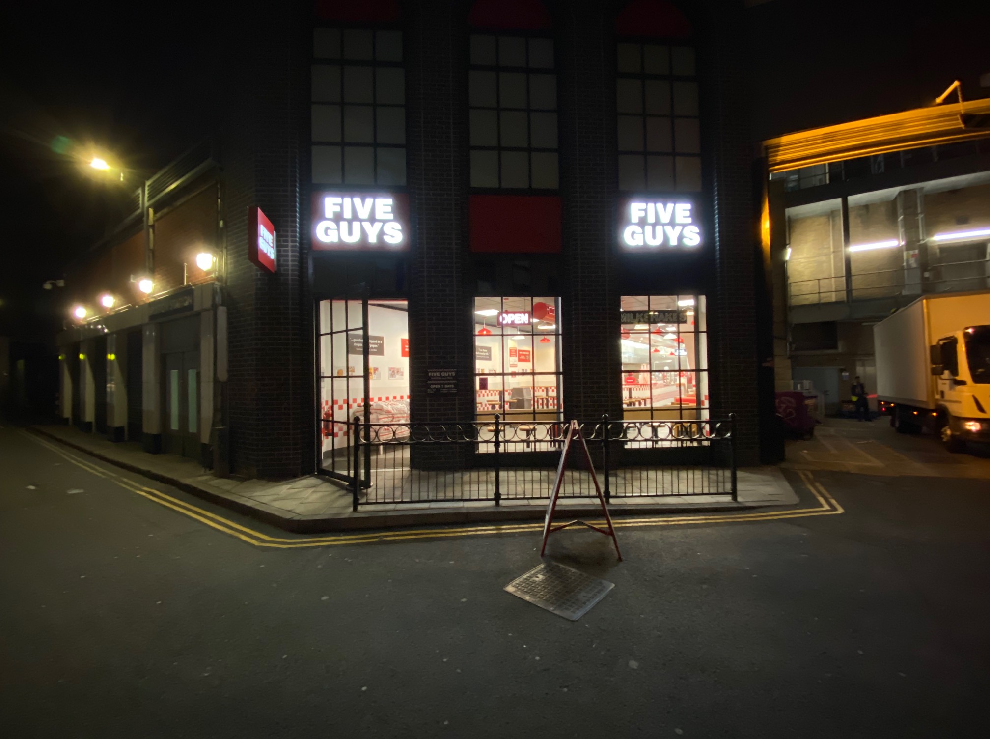 Hidden in Electric Lane, so no-one visits but just orders takeaways or deliveries. They have a “handler” who collects the delivery orders, so that the restaurant is not crowded with the delivery people. It is red and white, has a long open kitchen with very busy people frying, putting on toppings and bagging up. Of course there is the limitless soda fountain and the rather lethal milkshakes. Everyone knows what Five Guys offers – its “famous ‘boardwalk style’ fries, (hand-cut on site each day and cooked in 100% peanut oil), add spice for Cajun fries. In the entrance to the restaurant bags of potatoes are piled up and on the blackboard they give you the name and place where they come from for the days chips, as we call them. For us they came from Myrtle Grange Farm in Yorkshire. They also have burgers, Hot-dogs and Sandwiches.