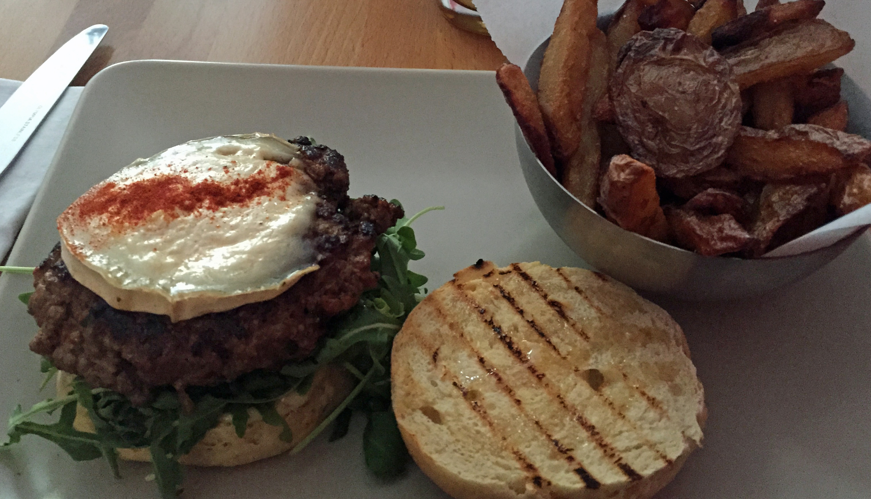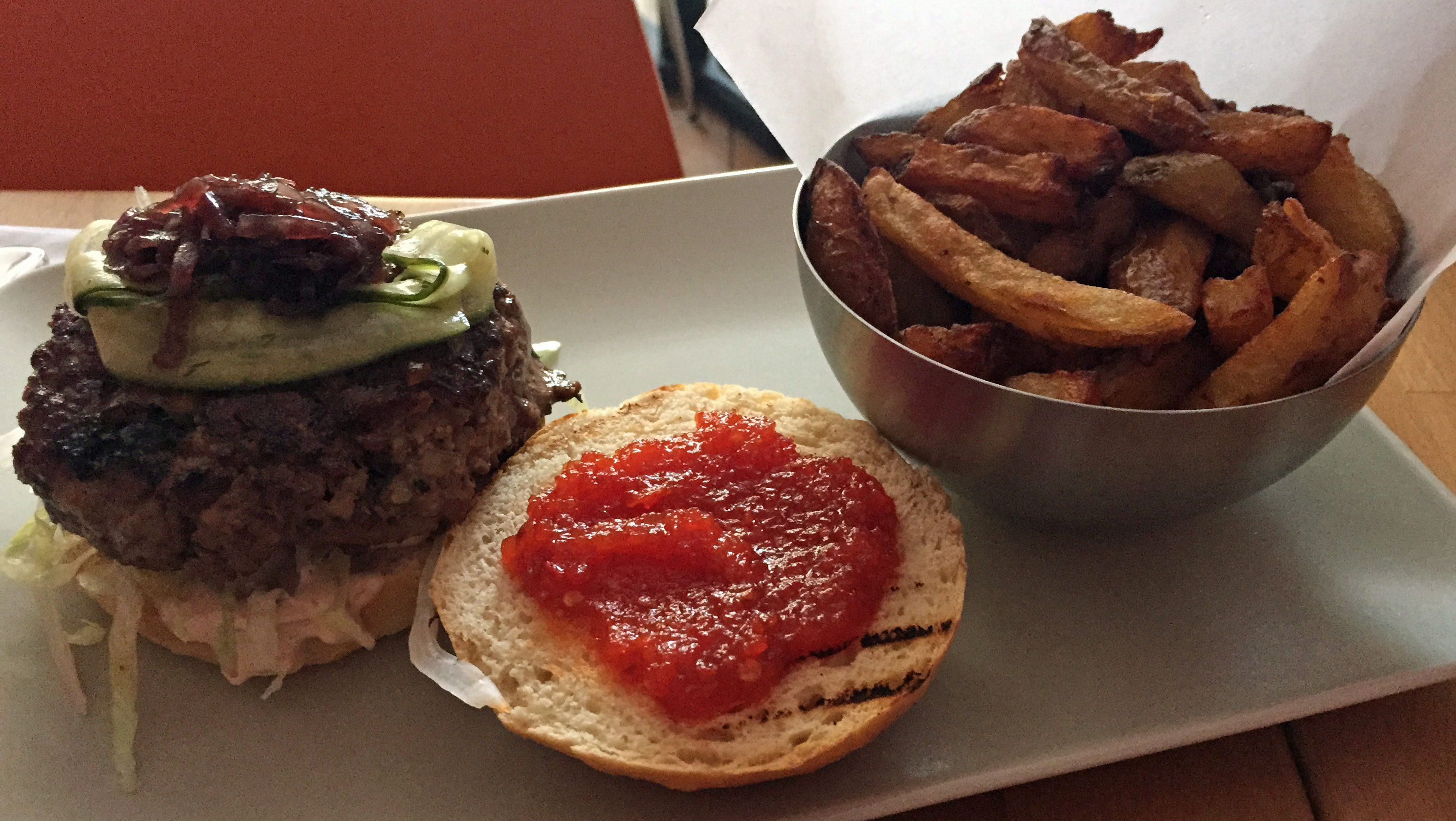 The menu is short and has three burgers, two beef and one chicken. There are also a couple of snacks as well as a few side dishes. We over-ordered as usual, covering the complete range of burgers, which means the classic beef (Dry aged, pasture raised Yorkshire chuck, brisket and bone marrow with lettuce, pickled cucumber, chili jam and the rest); the chicken burger (chopped breast, watercress, creamy leek sauce, onions) and the Honey Burger (paprika smoked beef, honey mustard mayo, rocket and goat’s cheese). All the burgers are in a “homemade” bun and come with hand cut, triple cooked chips.
