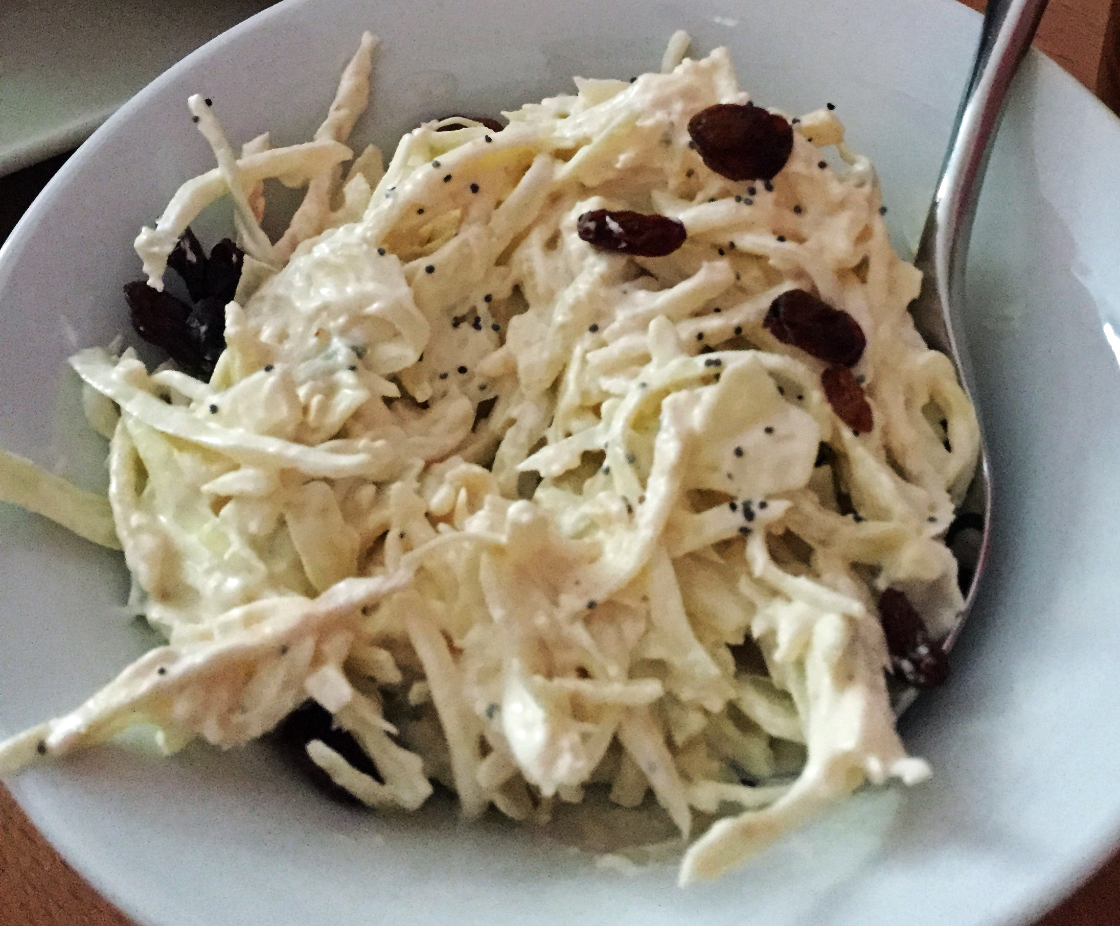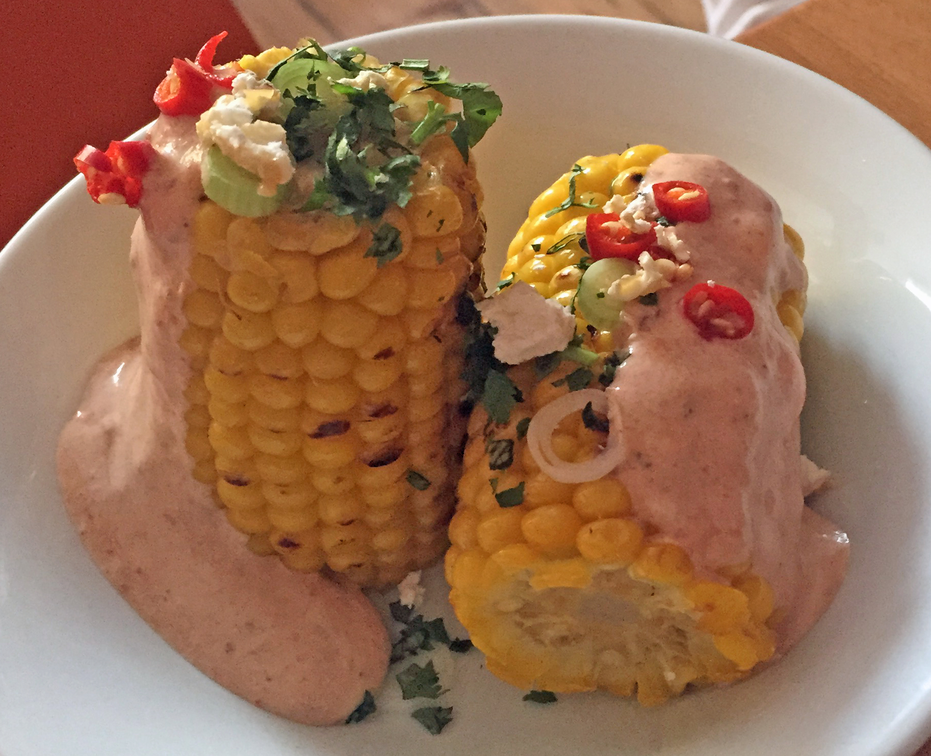 The three side dishes were chosen mostly for the inclusion of some veg: coleslaw (apple, celeriac, cabbage, raisins) – we couldn’t taste the apple -, baby gem lettuce (with crispy bacon, Stilton, pickles and green goddess dressing) – absolutely delicious and we wished we had ordered more – and something called “so Corny” which turned out to be two pieces of corn on the cob covered in chipotle cream and some chilli – watch out for the chilli as one member of our party didn’t and although she likes chilli this really put a stop to conversation.