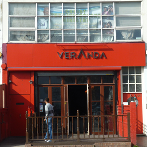 Veranda describes itself as a restaurant, cocktail bar and art gallery – and they are right. The entrance is a small hall (so people can be stopped if they are not invited) and the first part of the long room is the bar with small tables and some (but not much) comfortable seating. Most people cluster at the bar. At the back are the same small tables but now covered with white linen table cloths with white linen napkins. These tables are overlooked by the disc jockey who peers through an opening surrounded by a picture frame. In fact it took a couple of minutes to realise that this was not part of the art gallery on the surrounding walls. The gallery on our visit contained paintings – some predictable – red shimmering vistas and African images – but some very interesting photographs of people and landscapes.