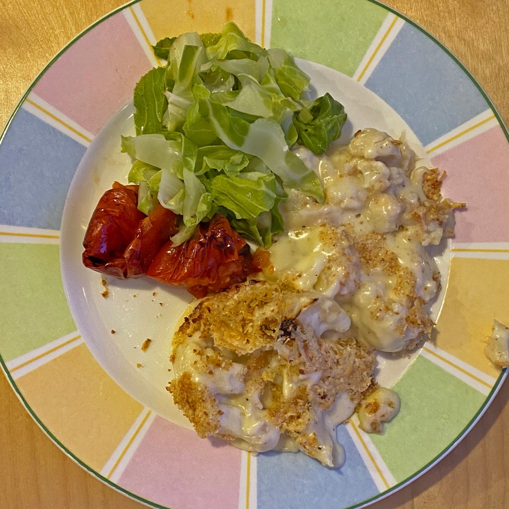 This is a sister restaurant to Trinity in Clapham Old Town which is seriously good and seriously expensive – but you are in for a treat whenever you visit. Back to Bistro Union. During the week they serve a choice of snacks, small and large plates as well as some to share. On Sunday for lunch it is similar but with a roast. Sunday supper is a fixed menu – blessed relief not to have to choose – and when we visited there were three courses and an optional one. Snacks were cheese goujons – light an fluffy. An optional course – a tomato salad with fragrant dressing that we chose and shared. The main course was a deconstructed Caesar salad – the salad plus four pieces of chicken and the desert a berry pavlova that was more like an Eton mess when it arrived but no problem – we wolfed it down.