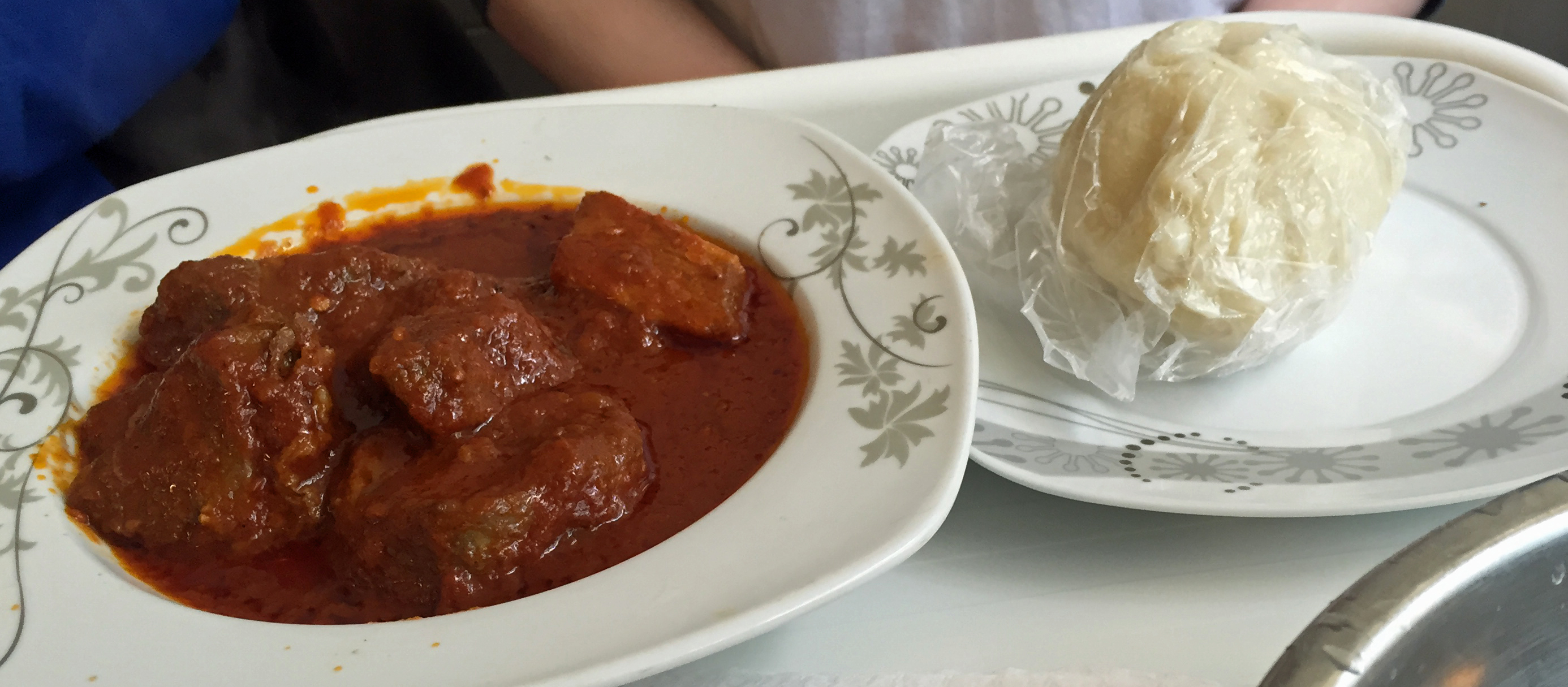 With each type of carbohydrate you can choose meat or fish or stew (usually tomatoes and something else – we have never asked). Sometimes this is very spicy but on our last visit was just really rich. But for the faint-hearted they also sell Jollof rice, which is a sort of colourful and spicy risotto.