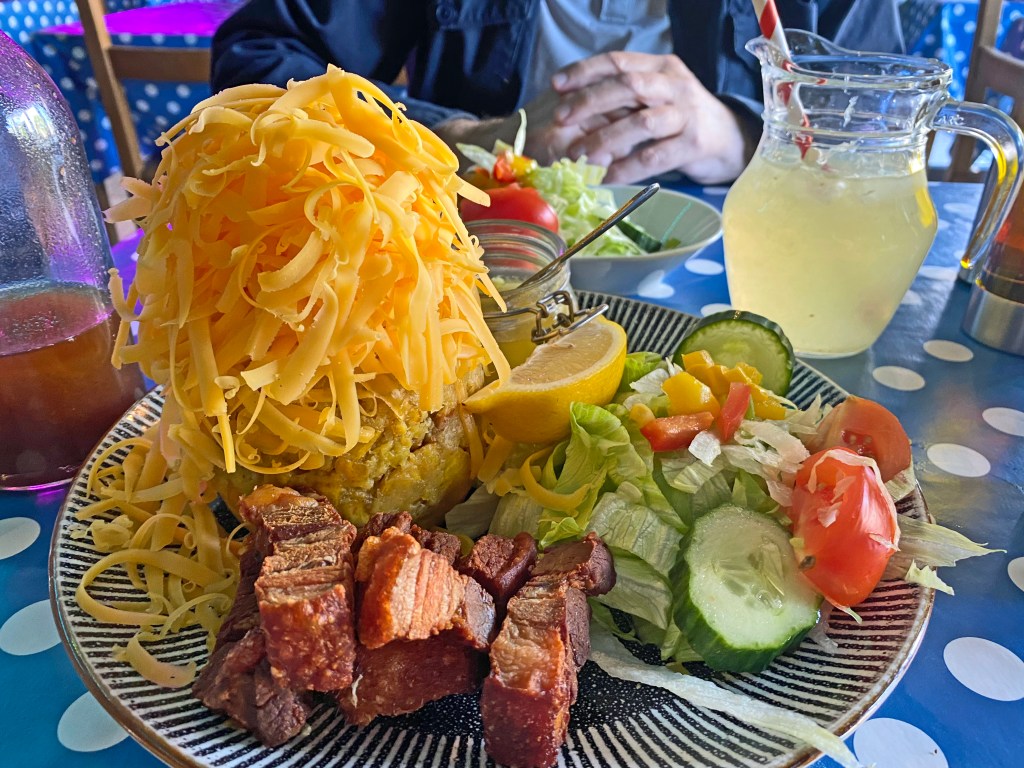 For mains we ordered the roast aubergine which comes with fried beans with salsa negra and Maya hummus – also vegetarian – with a side of Chimichurri skin-on potato fries which we dipped in a sauce that came with one of our dishes. This does need a knife and fork but the nuts provided some texture and the salsa was spicy again not as spicy as we would have expected although it does creep up on you.