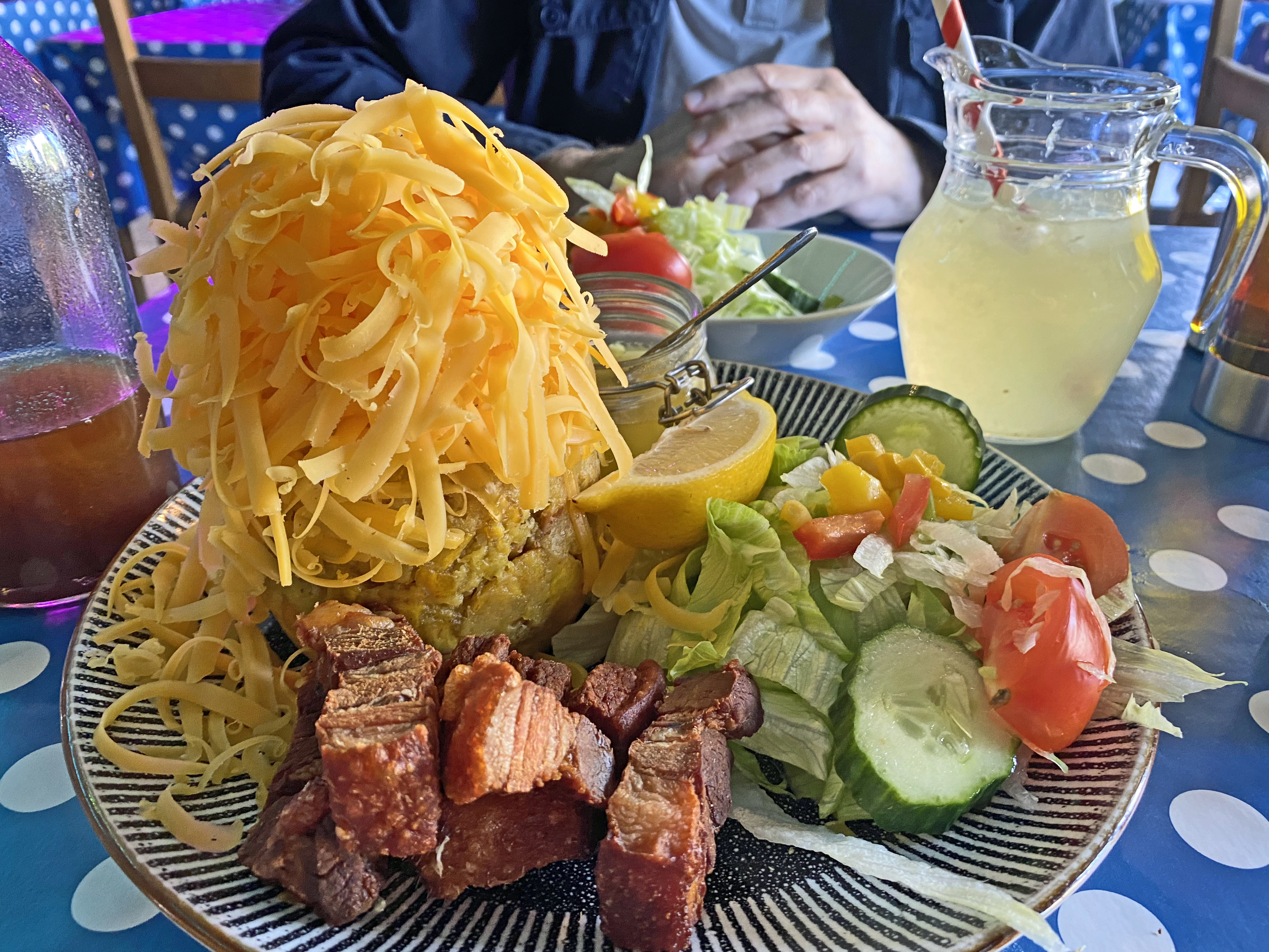 Inside (and outside) there are several places to sit. Having a broken ankle means the high bar in front of the kitchen was out of scope so they moved us to the tables and chairs section. It is now a bit on the chilly side so we would have objected to the al fresco dining area. I am sure it is fine in summer but even with heaters we noticed people keeping their coats on. Decor is (as is everything) inspired by Latin America – colourful walls, paintings – some for sale.