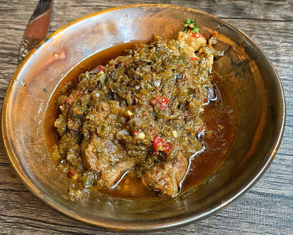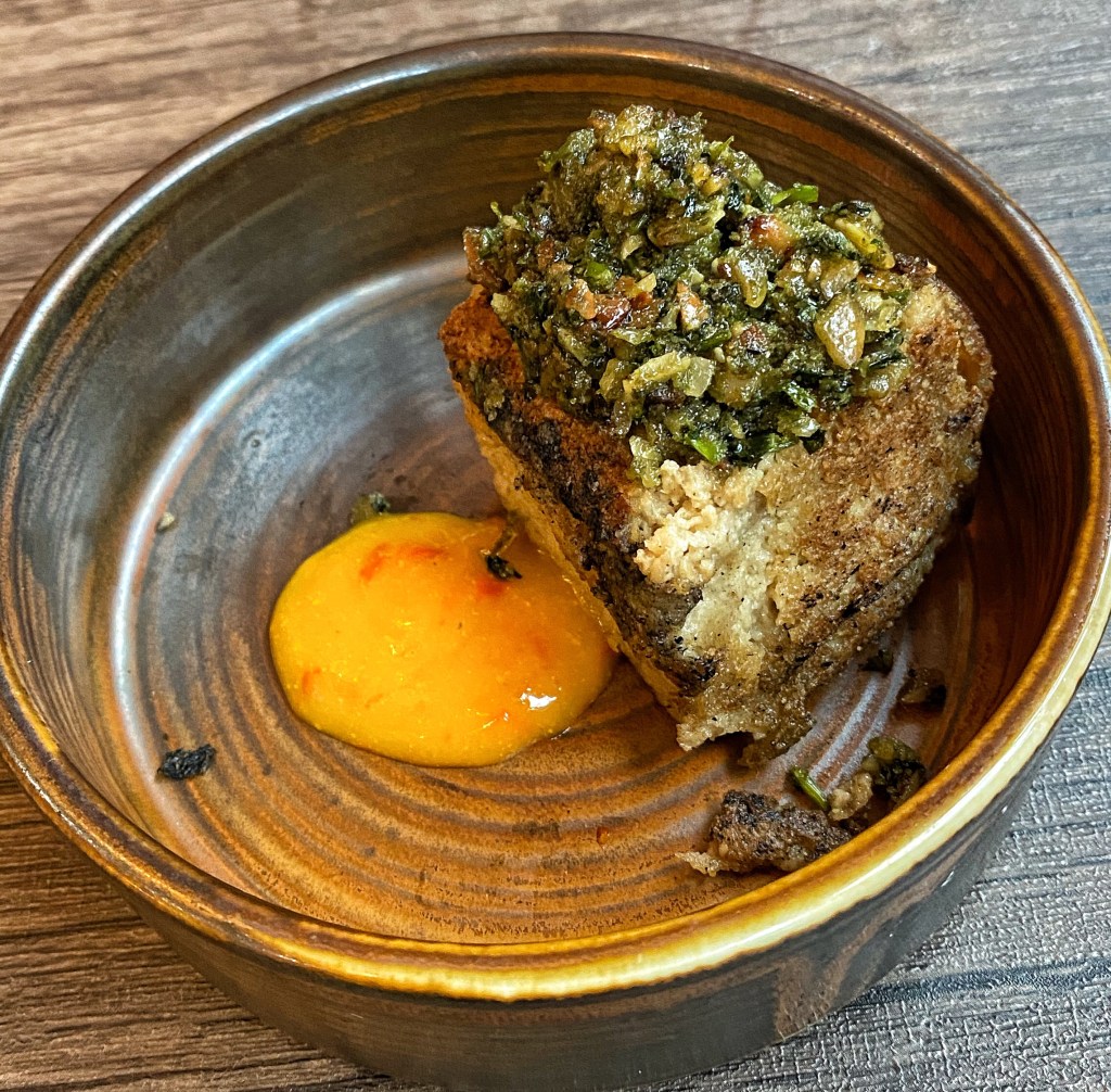 There is a blessedly short list on the menu with starters, main courses, sides and desserts – just a few in each category. We shared Ekuru as a starter – it’s native to the Yoruba. It is (I think) made of peeled black eyed beans and wild water melon seeds and the paste is then fried. It comes with pumpkin seed pesto and scotch bonnet sauce. This was a soft and crisp start to the meal with delicious pesto, so I hope you haven’t thrown out those pumpkin seeds.