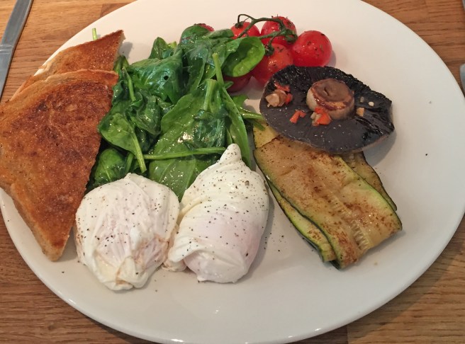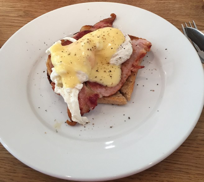 There are various choices all involving eggs and some involving bacon. We chose the Wild Caper special and bacon and eggs on toast. When they arrived the special – despite being a quid cheaper – filled the plate. I really enjoyed this meal and ate all on the plate. Bacon on smaller plate (see photo) was also very good.