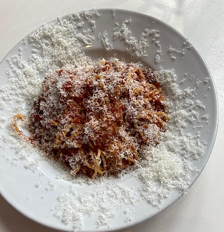 Next on to the pasta – again two of us chose the same dish – linguine with crab, datterini and capers – the other member of our group, daring to be different, chose spaghetti, roasted tomatoes and parmesan, lots of parmesan. It turns out that datterini are actually tomatoes which you can see in the photo. The literal translation is “little dates” as they are small, elongated and very sweet. All plates were licked clean – not because we were that hungry after the huge starters, but because it was delicious.