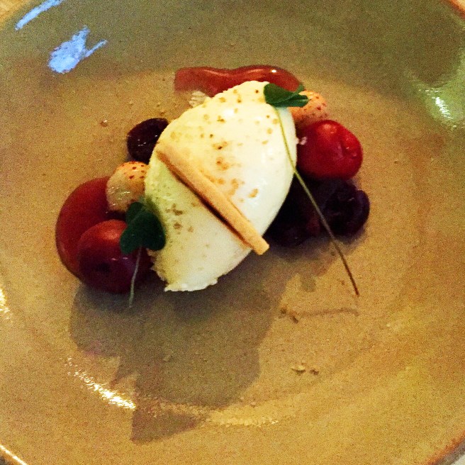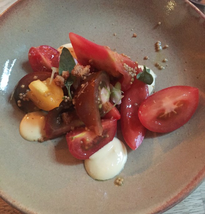 Then we moved on to the main menu – a delicious tomato salad with elderflower and mustard. I am soon going to run out of superlatives as it was the best thing to start us off – fresh with little bursts of mustard flavour. All four of us were delighted.