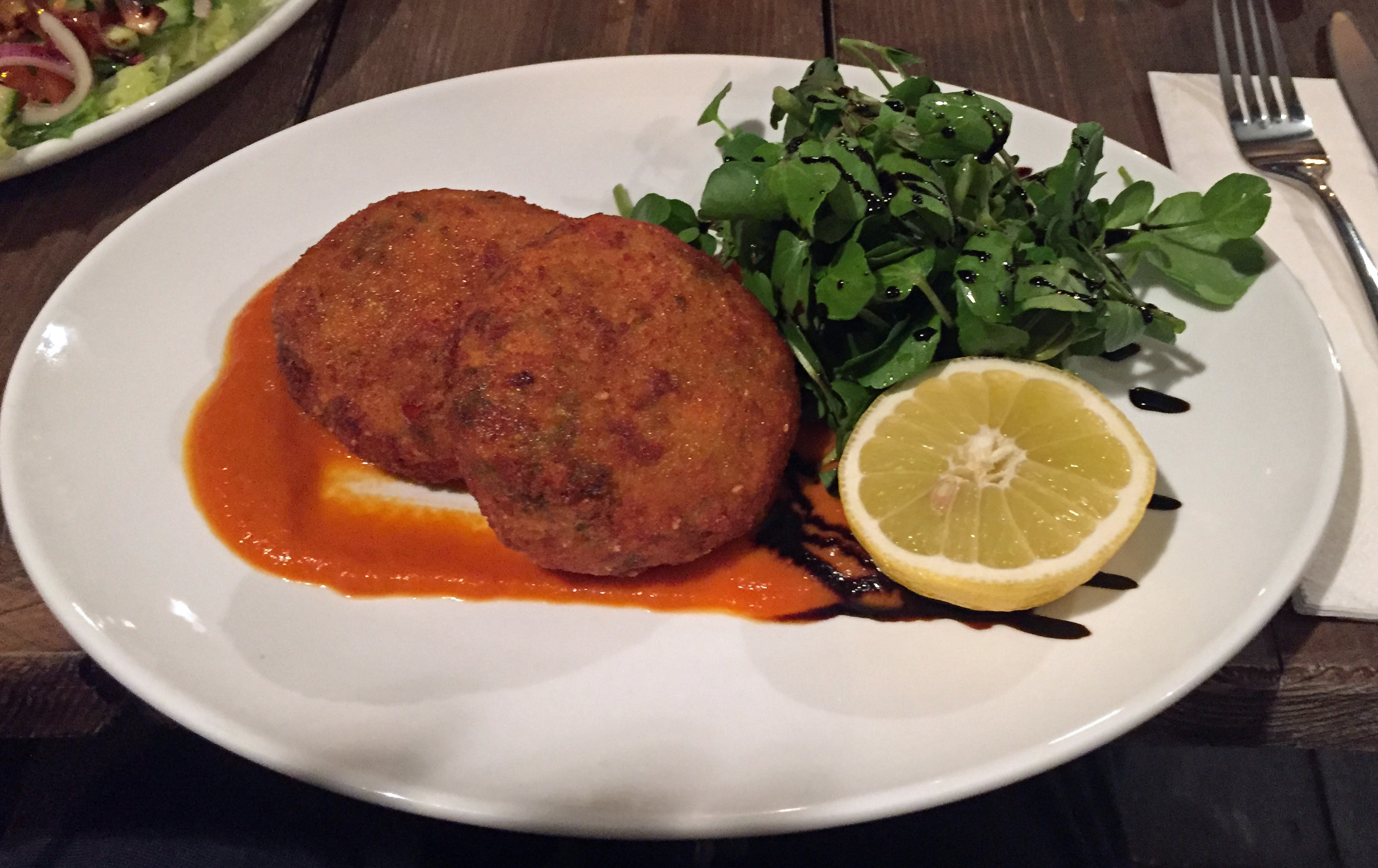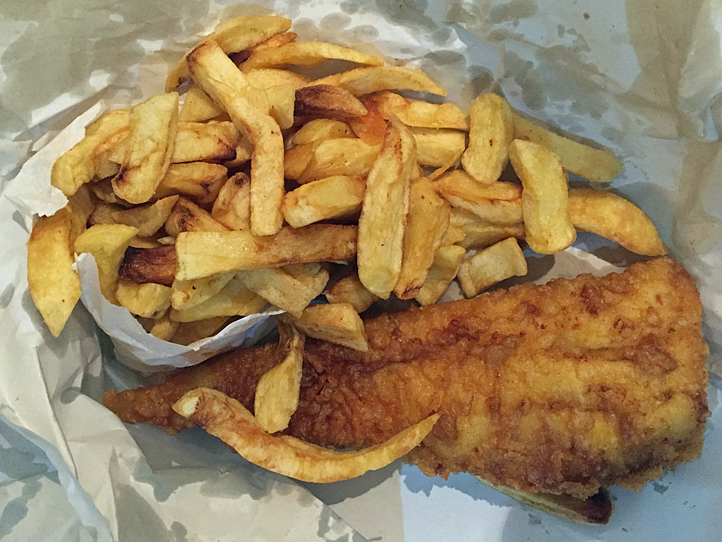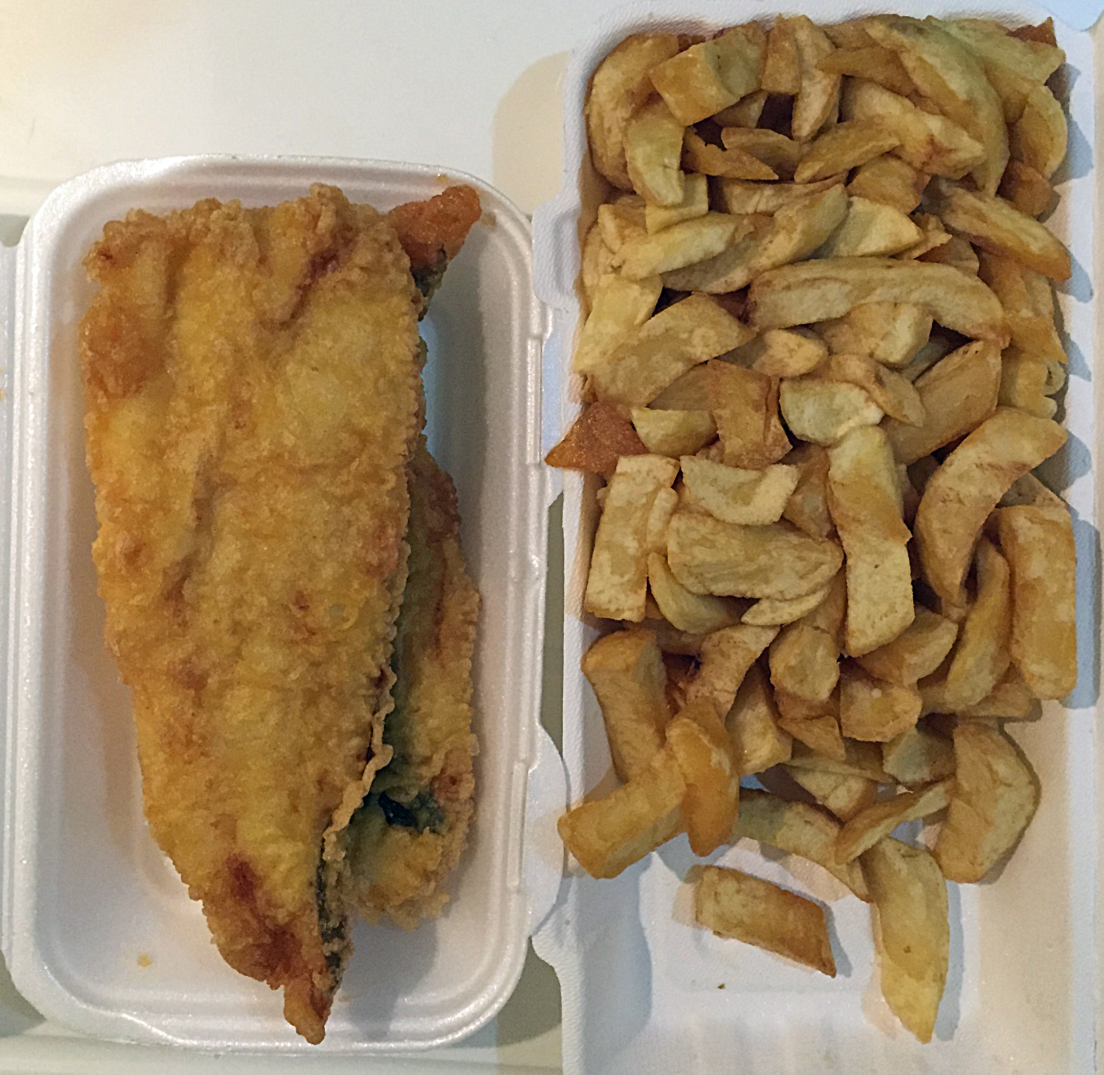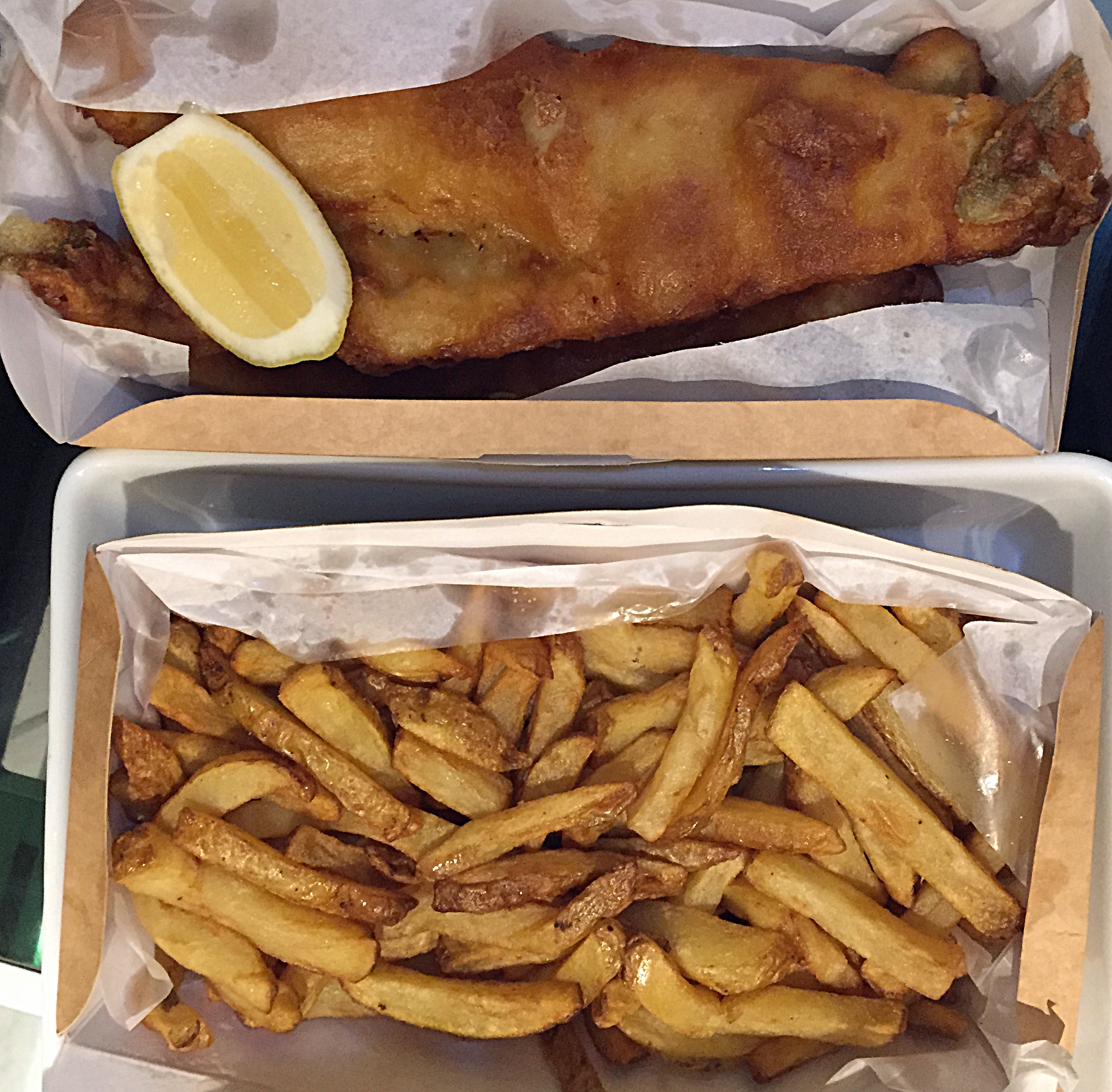 Friday night is always busy in Brixton, despite the move to Thursday celebrations – but we are old fashioned enough to think that Friday means fish and chips. We re-visited an old haunt that we refer to the hip hop chip shop on the corner of Coldharbour Lane and Atlantic Road – our last review is here. This was busy (we hadn’t booked), but they squeezed us in – literally to two seats near the bar. But although we hankered after something from the sea, we were to be disappointed. Their order has not arrived, so we were left with the mostly meat options. Just to wet your appetite prawns, fish fingers and battered cod are on the menu.